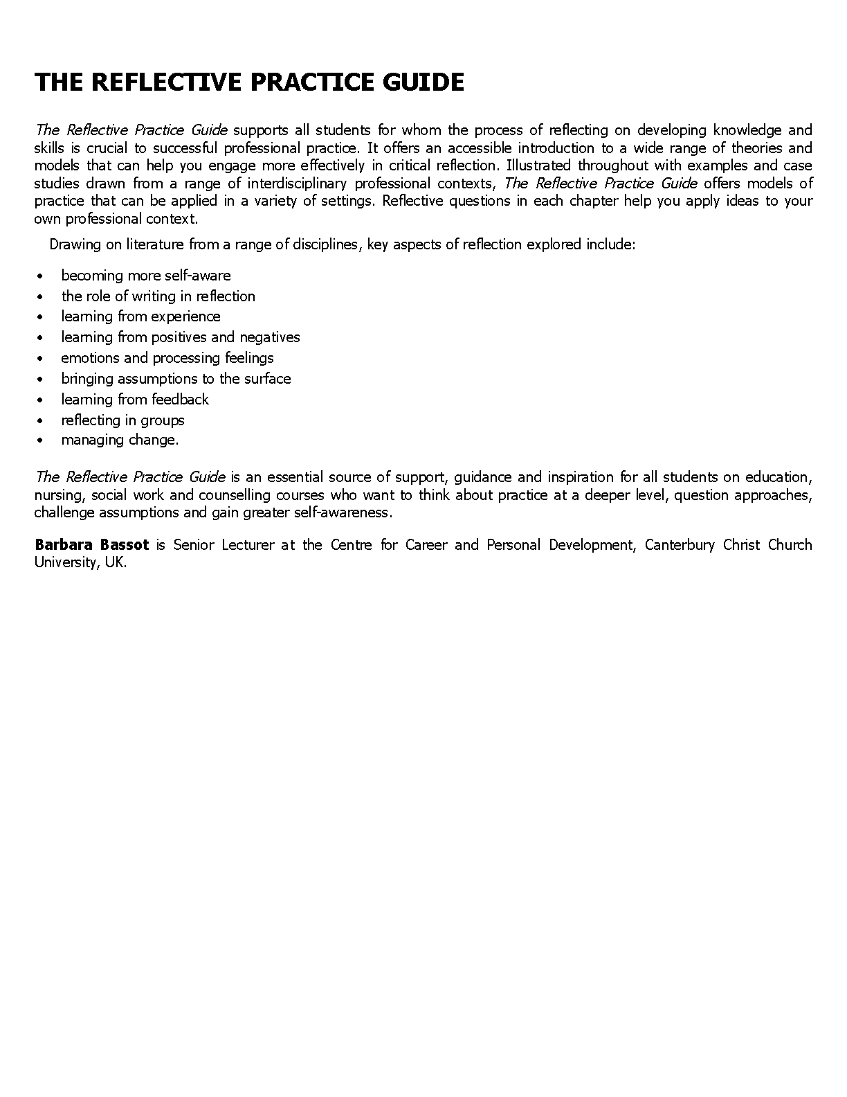 Master the essential skill of critical reflection with the latest 2025/2026 updated resource for 'The Reflective Practice Guide, 3rd Edition'. Authored by Barbara Bassot, this comprehensive guide offers an invaluable interdisciplinary approach, packed with practical models, engaging activities, and real-world case studies. Perfect for students across health, social care, education, and beyond, this guide is your key to developing deeper insights, enhancing your professional practice, and achieving top grades. Secure your success and pass your exams on the first try with this essential academic companion.