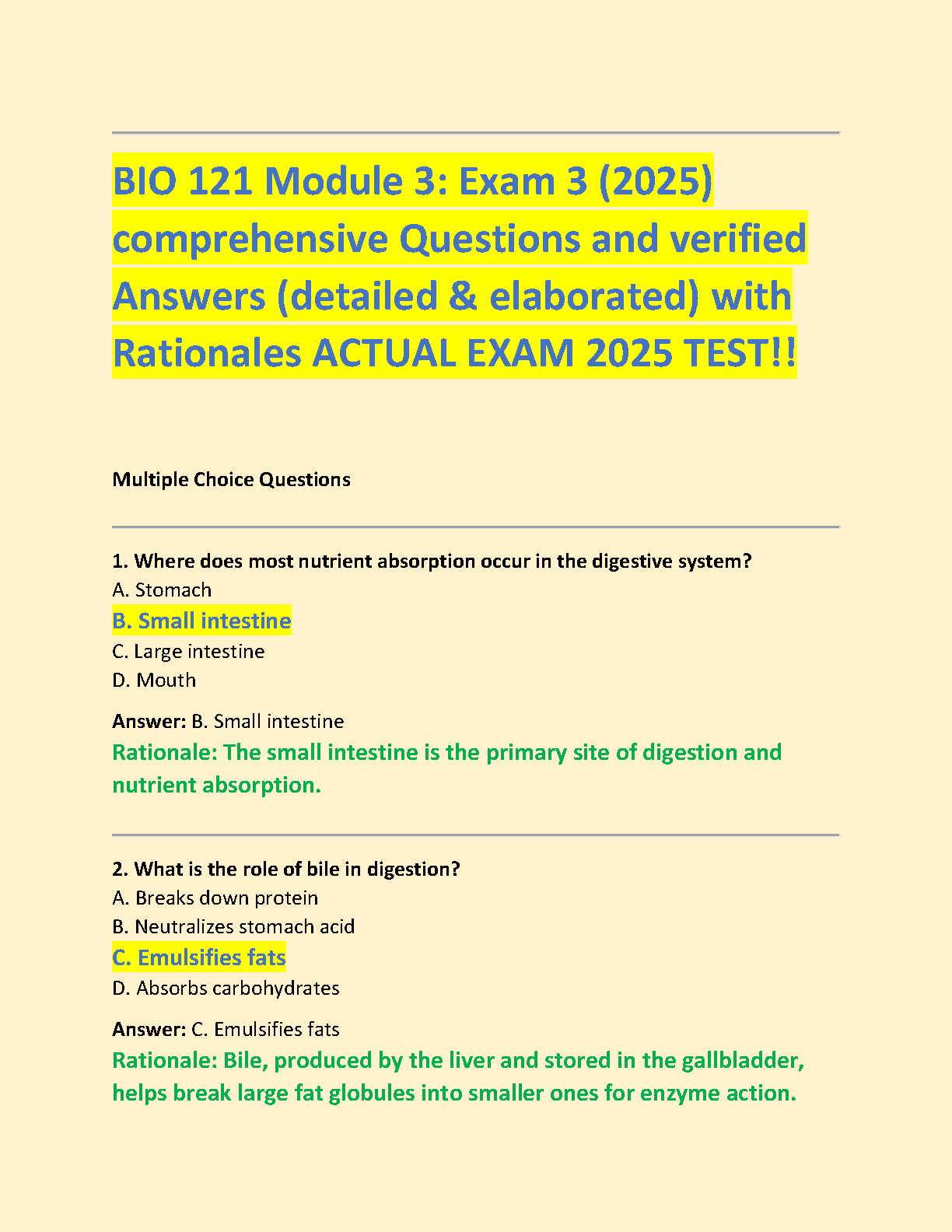 Ace your BIO 121 Module 3 Exam 3 with our comprehensive test bank! This study guide features a complete set of verified questions directly aligned with the course curriculum. Each question is followed by the correct answer and a detailed, elaborated rationale to help you understand the core concepts of biology, not just memorize facts. Prepare efficiently, identify areas for improvement, and walk into your exam with the confidence to earn a top grade. This is the ultimate resource for students aiming for success in BIO 121.