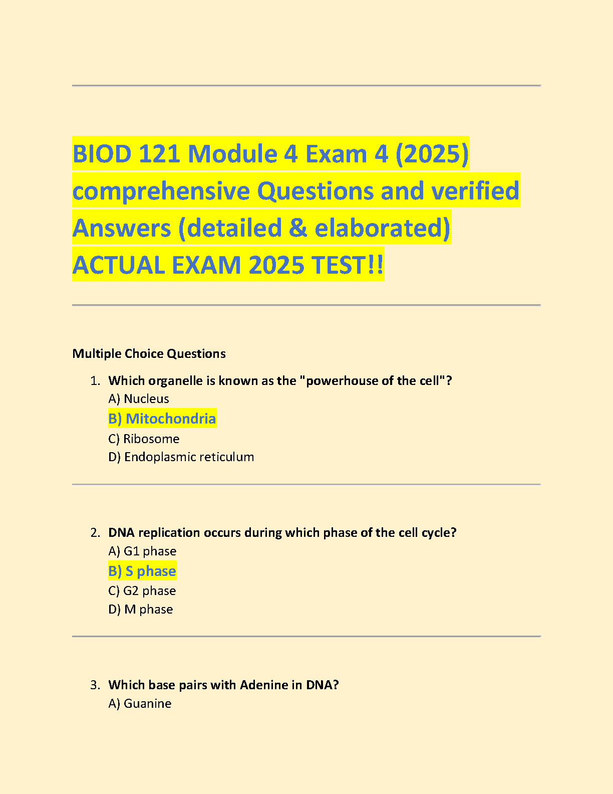 Unlock your academic potential with the ultimate study resource for the BIOD 121 Module 4 Exam. This 2025/2026 test bank is packed with comprehensive, actual exam questions and verified, step-by-step answers. Each solution is detailed and elaborated to ensure you grasp core concepts, from cellular powerhouses like mitochondria to the intricacies of the DNA replication cycle. This guide is expertly designed to help you prepare efficiently, ace your exam on the first try, and avoid stressful resits. Download now and secure your top grade!