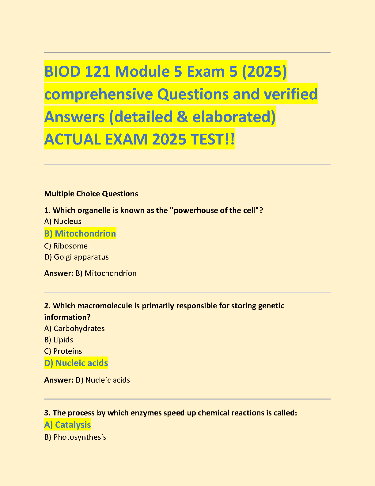 Get ready to excel in your BIOD 121 course with our latest test bank for the Module 5 Exam, fully updated for the 2025/2026 academic year. This comprehensive resource features a collection of actual exam questions, each accompanied by a verified, detailed, and elaborated answer. Designed to cover all essential topics from Module 5, this study guide is your key to mastering the material, boosting your confidence, and passing your exam with flying colors on the very first try. Avoid the stress of resits and secure top grades with this essential preparation tool.