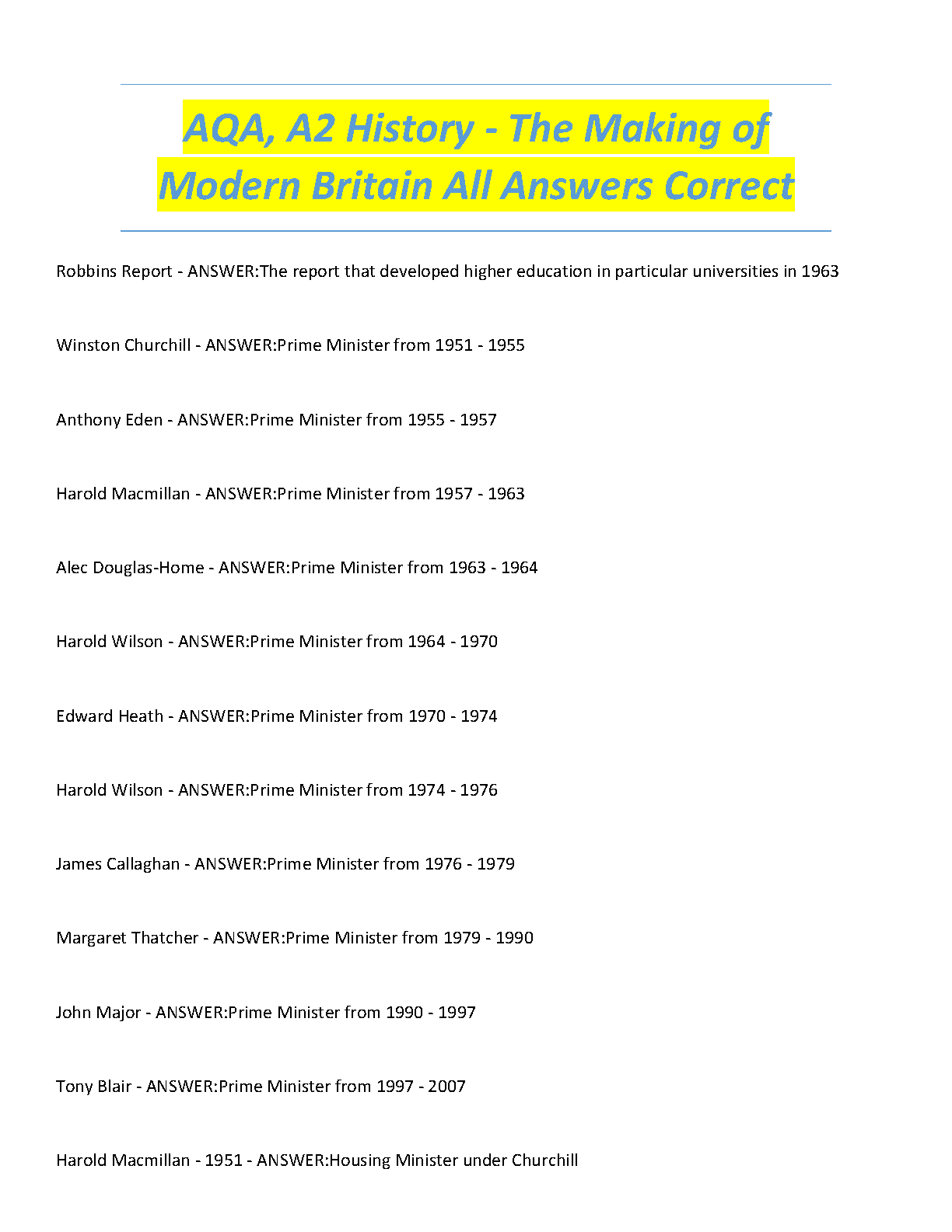 Unlock exam success with our comprehensive study guide for the AQA A2 History module, The Making of Modern Britain. This meticulously compiled resource features a complete set of verified questions and answers, covering all essential topics, from the Robbins Report to the tenures of key Prime Ministers like Churchill, Thatcher, and Blair. Designed for the 2025/2026 academic year, this guide is your ultimate tool for efficient revision. Master the key facts, understand the timeline of modern British politics, and gain the confidence to ace your exams on the first attempt, leaving resits behind. Download now and streamline your study process for guaranteed results.