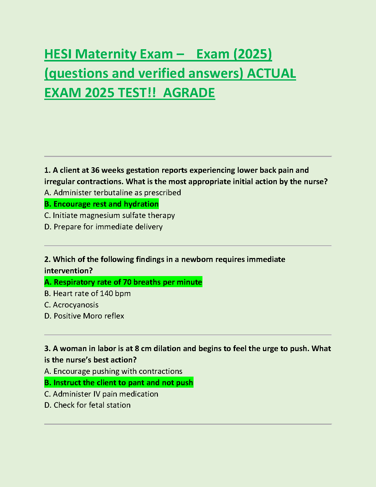 Ace your HESI Maternity Exam on the first attempt with our updated 2025/2026 test bank. This guide features a comprehensive collection of actual exam questions with verified answers, designed to help you master key maternity nursing concepts and secure an A-grade. Stop worrying about resits and confidently prepare for success with this essential study resource.
