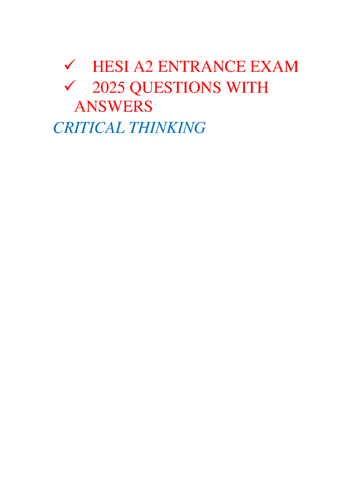 Unlock your nursing school potential with our comprehensive HESI A2 Critical Thinking Test Bank, fully updated for the 2025-2026 academic year. This essential study guide is meticulously designed to help you ace the HESI A2 entrance exam on your very first try. Inside, you'll find an extensive collection of over 2025 practice questions, each paired with a detailed answer and rationale. This resource focuses specifically on the critical thinking component, equipping you with the skills and confidence needed to tackle the toughest questions. Stop worrying about resits and start your journey to becoming a healthcare professional. Get the ultimate preparation tool and secure your spot in your dream nursing program!