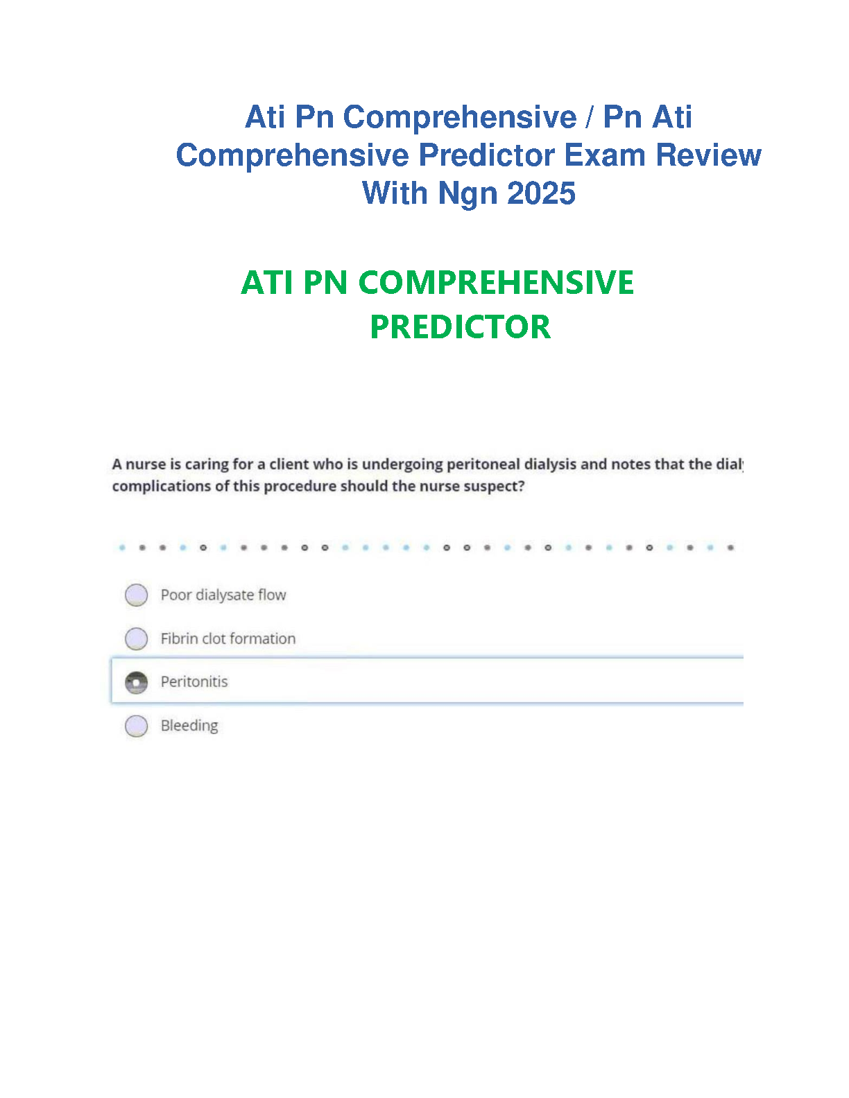 Ace your nursing exams with confidence using our latest ATI PN Comprehensive Predictor Exam Review Test Bank for the 2025-2026 academic year. This guide is fully updated with Next Generation (NGN) style questions, providing you with the most relevant and targeted practice available. Master complex topics, understand key nursing concepts, and get the preparation you need to pass the ATI PN Predictor on your very first try. Stop worrying about resits and secure your path to becoming a licensed practical nurse with this essential study resource.