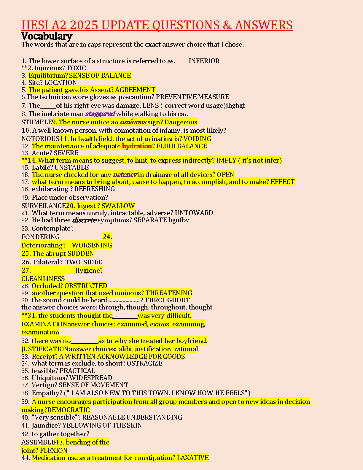 Unlock your potential and guarantee success on your first attempt with our comprehensive HESI A2 Vocabulary study guide for the 2025-2026 academic year. This essential resource features the latest, most frequently asked questions paired with their precise answers. Designed to help you master critical terminology, build confidence, and ace the vocabulary portion of your HESI A2 exam, this guide is your key to avoiding resits and advancing your nursing career.