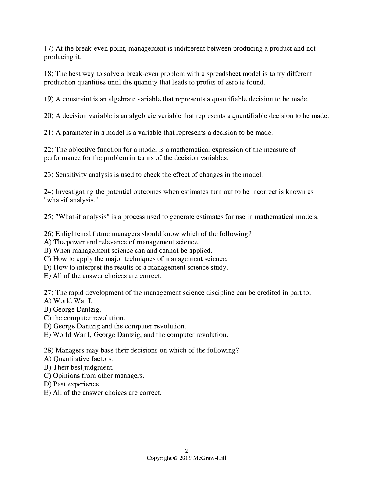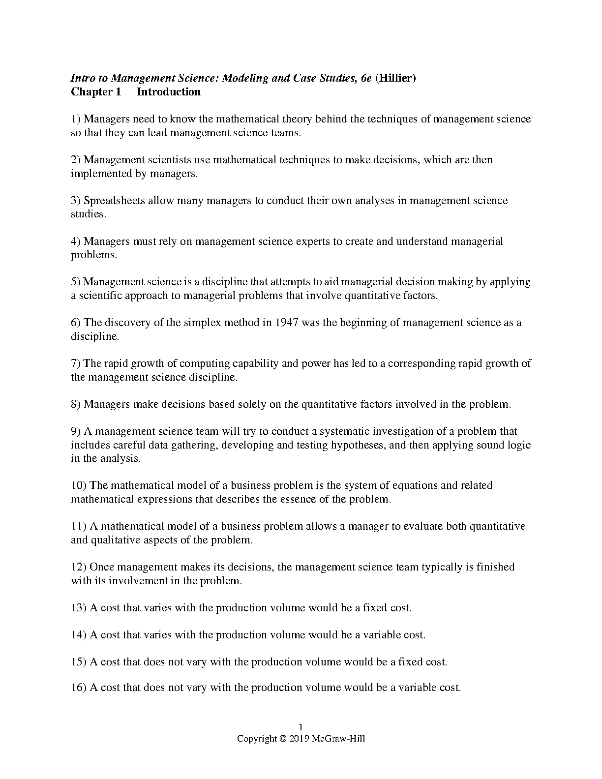 Instantly access the complete Test Bank for the 6th Edition of 'Introduction to Management Science' by Frederick S. and Mark S. Hillier. This essential study aid is packed with a vast collection of exam-style questions and detailed answers covering every chapter. It's expertly designed to help you thoroughly prepare for your exams, master complex concepts, and secure the highest possible grade. Download now to start practicing and ensure you pass your course on the first try!