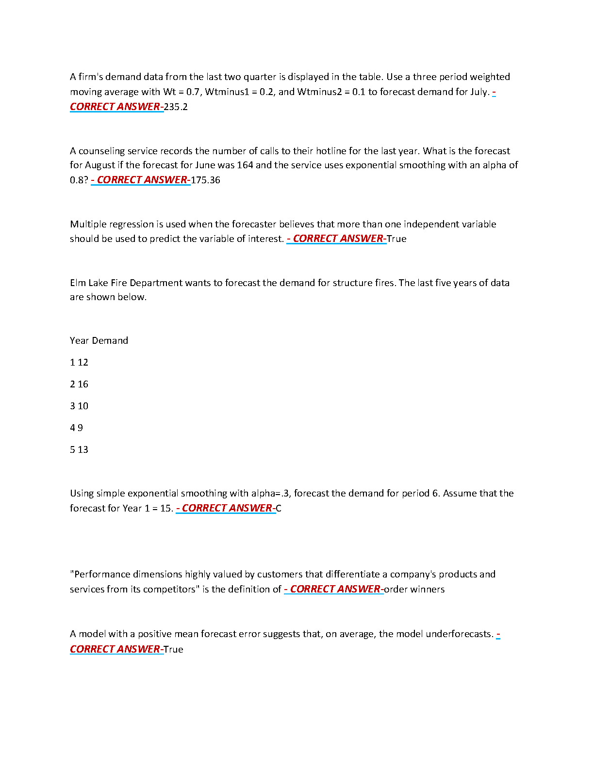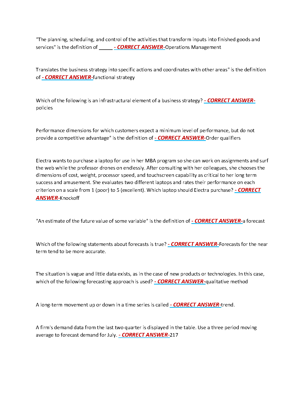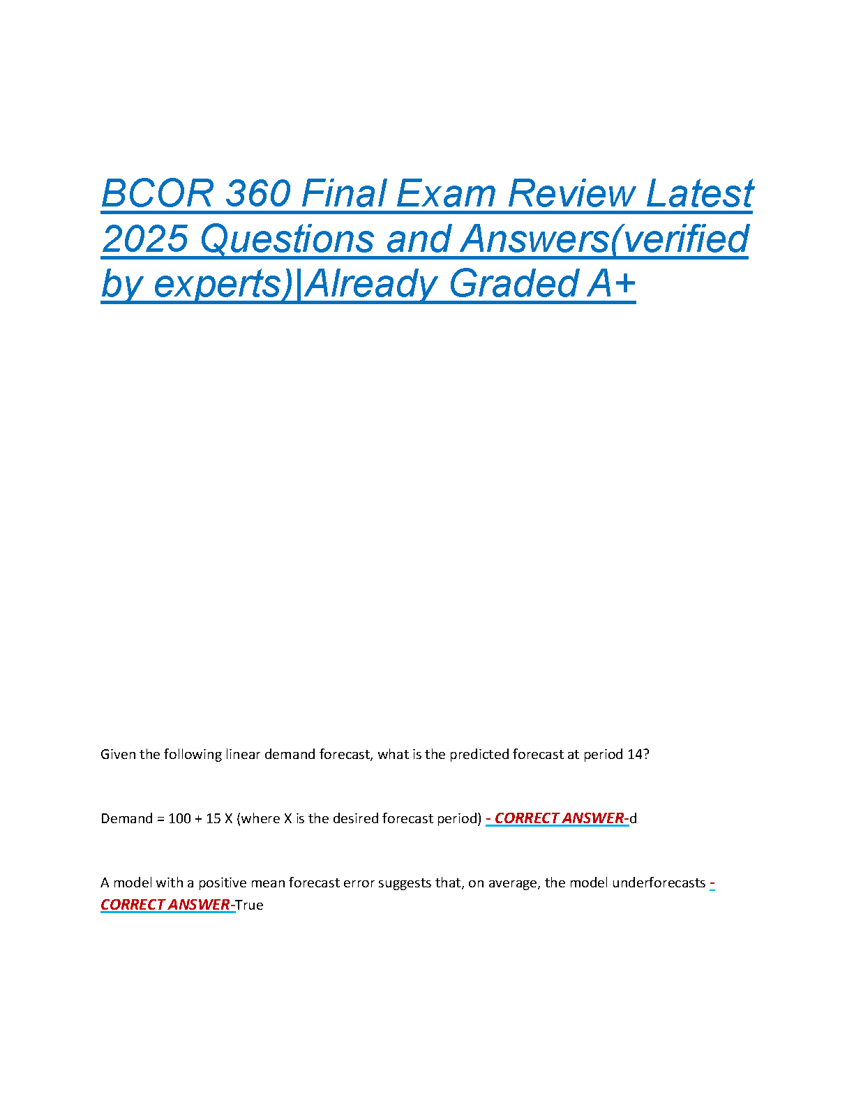 Ace your BCOR 360 Final Exam with this comprehensive test bank, fully updated for 2025. This essential study resource features a complete collection of final exam questions with detailed, expert-verified answers. Our materials are designed to help you master key concepts, such as demand forecasting and operations management principles, ensuring you are fully prepared to pass on your first attempt and achieve an A+ grade. Stop struggling and start studying smarter with this proven review guide.