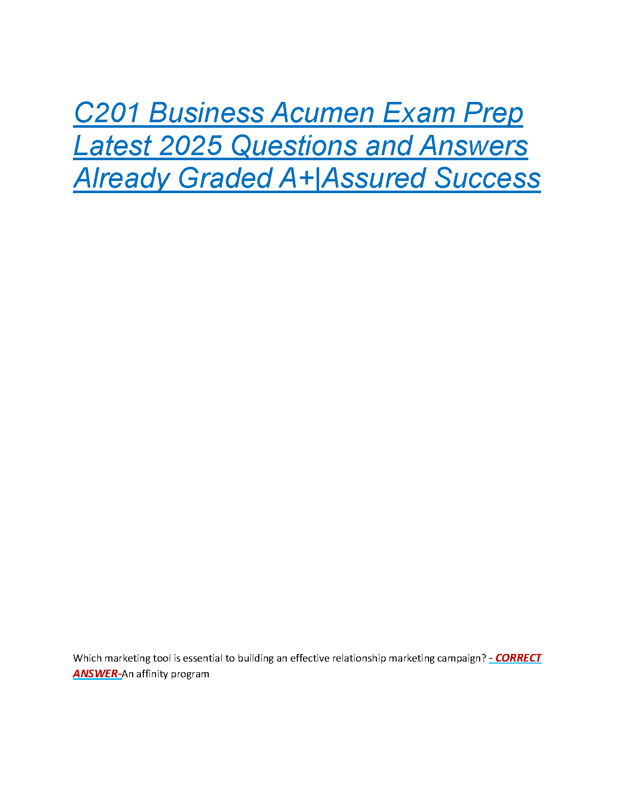 Master the concepts of WGU's C201 Business Acumen course with our comprehensive test bank. This study guide features a complete collection of the latest exam questions, each with verified, correct answers. Designed to help you understand key topics and prepare effectively, this resource is your key to acing the C201 exam. Get instant access to A+ graded material and boost your confidence for success.