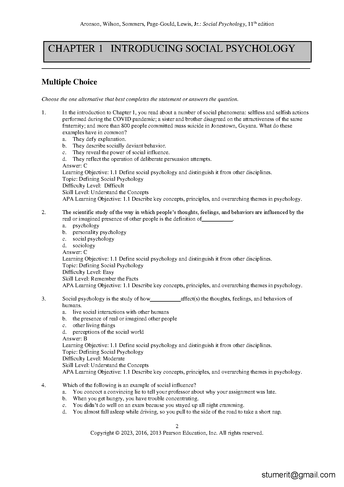 Test Bank for Social Psychology, 11th Edition by Aronson, Wilson, Sommers, Page-Gould & Lewis Jr.