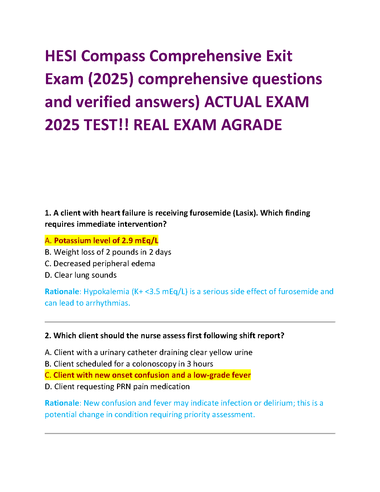 Prepare to excel on your HESI Compass Comprehensive Exit Exam with our latest 2025/2026 study guide. This essential resource is packed with a vast collection of actual exam questions, each accompanied by a verified answer and a detailed rationale to deepen your understanding. Designed specifically to help nursing students master key concepts and critical thinking skills, this guide is your key to passing the exam on your first attempt and avoiding costly resits. Get the A-grade you deserve and take the next step in your nursing career with confidence!