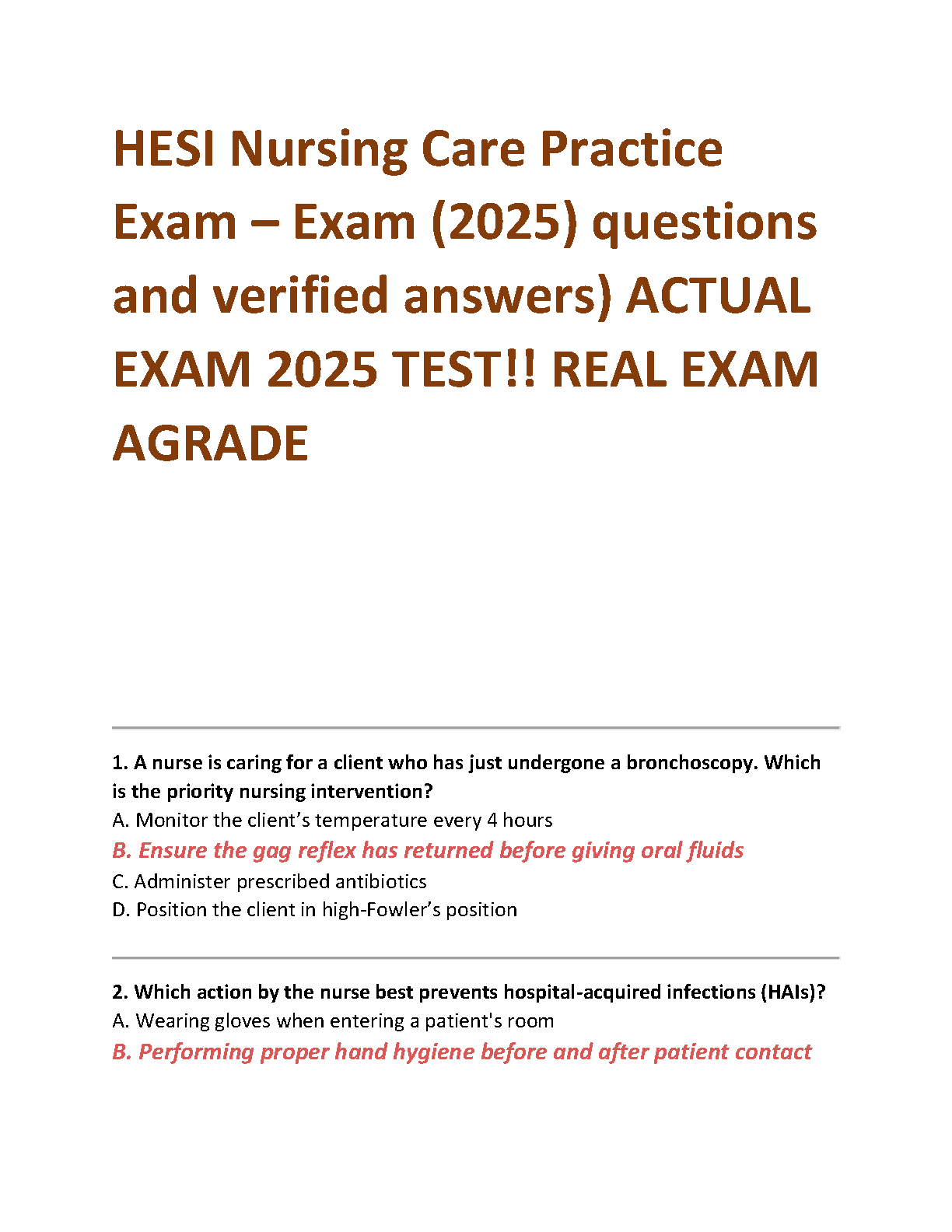 HESI Nursing Care Practice Exam 2025 Test Bank | Actual Exam Questions and Expert-Verified Answers to Help You Pass