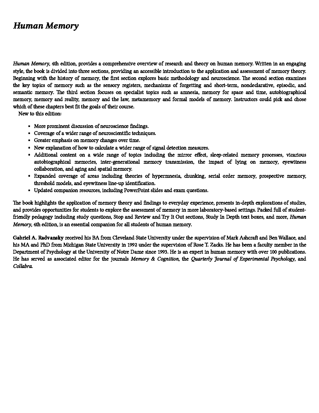Test Bank for Human Memory, 4th Edition by Gabriel A. Radvansky