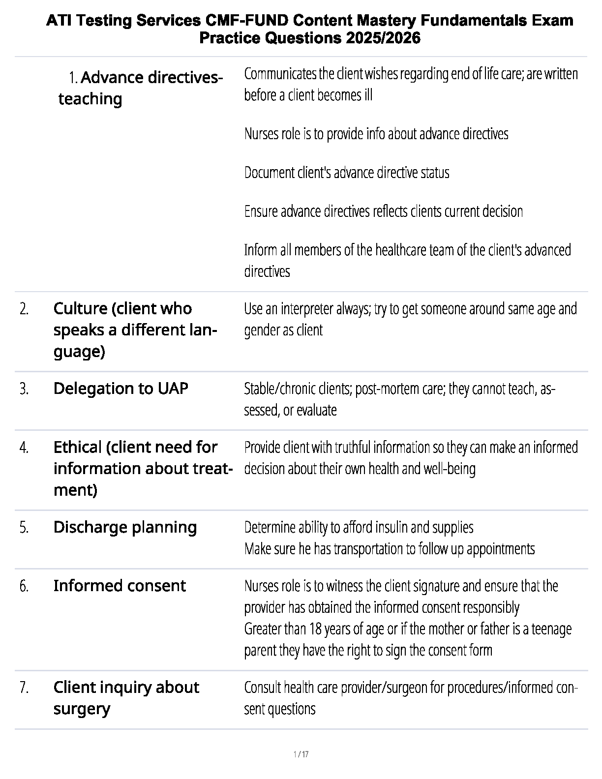 Ace your nursing exams with our comprehensive study guide for the ATI CMF-FUND Content Mastery Fundamentals Exam, fully updated for the 2025/2026 academic year. This essential resource provides detailed explanations and key insights into crucial nursing fundamentals, including advance directives, delegation to UAP, informed consent, and ethical considerations. Designed to help you master the core content and build confidence, our guide includes verified practice questions and answers. Prepare effectively, understand the key concepts tested by ATI, and ensure you pass on your very first attempt, avoiding the stress of resits. Get the ultimate preparation tool for your nursing success!