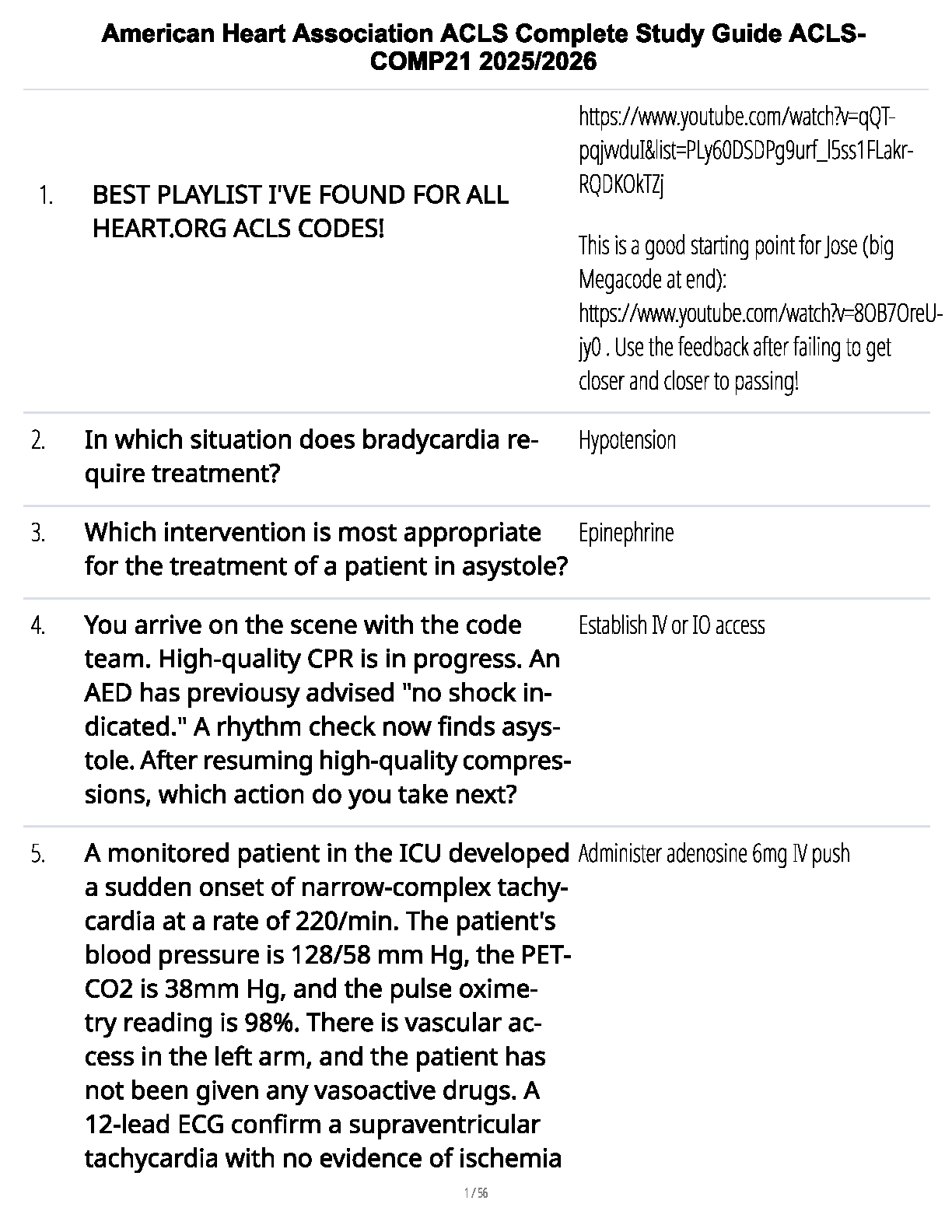 Master the American Heart Association (AHA) ACLS certification exam with our newly updated 2025/2026 ACLS-COMP21 Test Bank. This complete study guide provides an exhaustive collection of practice questions and detailed answers, mirroring the actual exam format. Covering all critical algorithms and scenarios, from bradycardia and asystole to complex tachycardias, this resource is meticulously designed to ensure you pass on your first attempt. Equip yourself with the essential knowledge and confidence to excel in your ACLS certification and avoid costly resits.