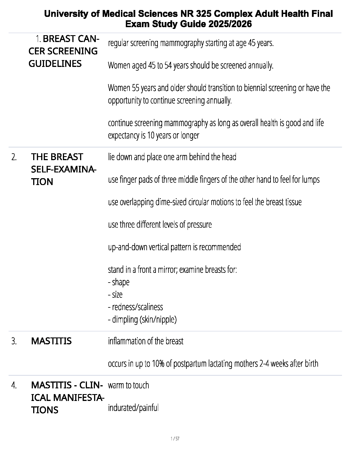 Excel in your nursing program with our latest NR 325 Complex Adult Health Final Exam Study Guide for the 2025/2026 academic year. This comprehensive resource is meticulously crafted to help you master all key concepts, from breast cancer screening guidelines to clinical manifestations of various health conditions. Our easy-to-follow format simplifies complex topics, ensuring you are fully prepared to pass your final exam on the first attempt and avoid costly resits. Invest in your success and ace your Complex Adult Health course with confidence!