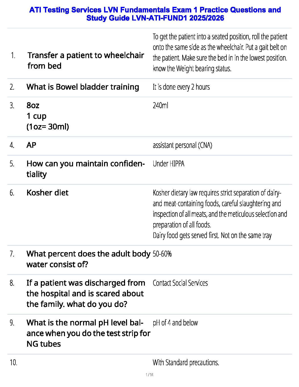 Ace your ATI LVN Fundamentals Exam 1 with confidence using this brand-new, comprehensive study guide for the 2025/2026 academic year. This essential resource is specifically designed to help you pass on your first attempt, featuring a detailed collection of practice questions and verified answers. Master key nursing concepts including patient transfers, confidentiality (HIPAA), Kosher dietary laws, bladder training, and other fundamental skills tested on the exam. Stop worrying about resits—this guide provides the focused preparation you need to succeed and advance in your LVN program.