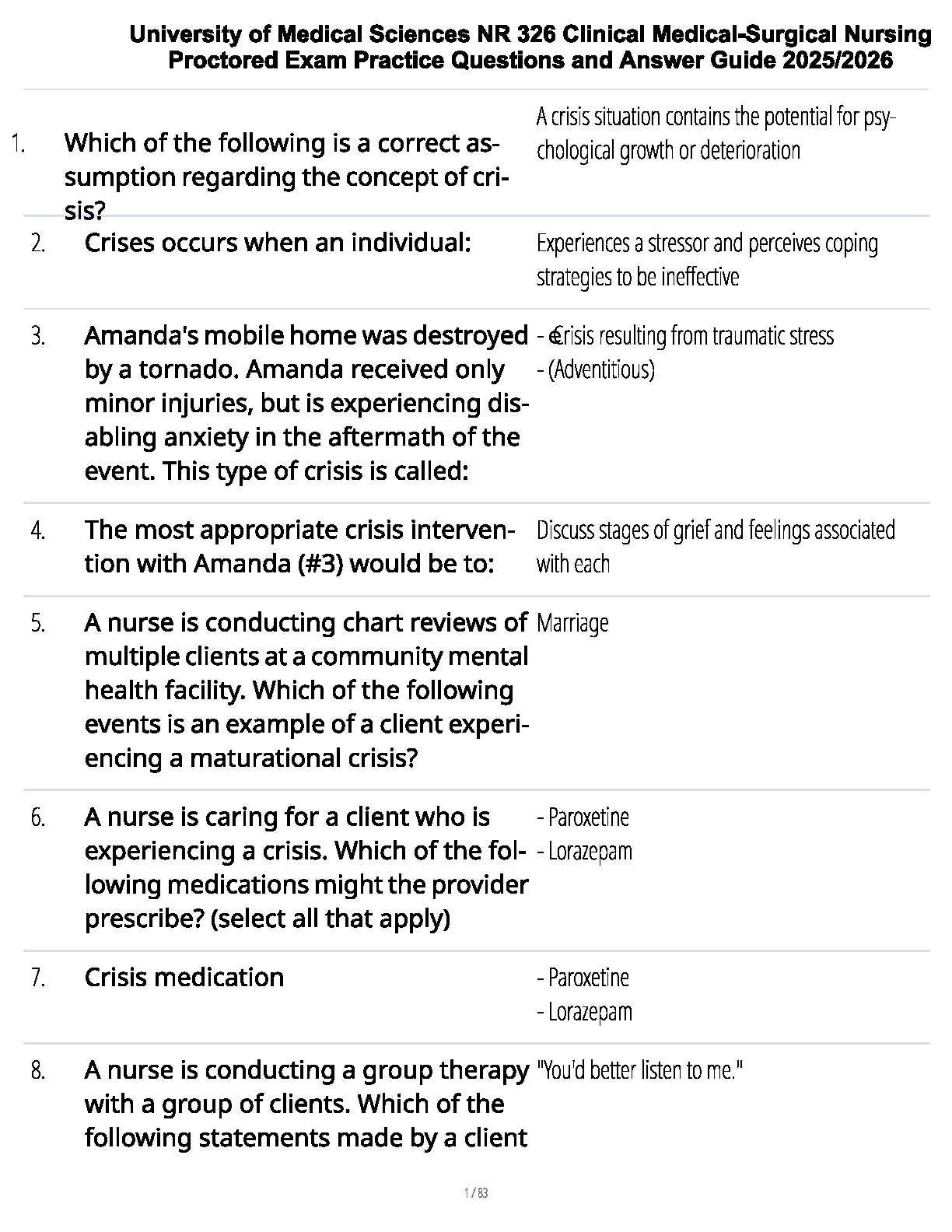 Unlock success in your nursing studies with our newly released 2025/2026 Test Bank for NR 326 Clinical Medical-Surgical Nursing. This ultimate study guide is meticulously crafted to help you master the proctored exam on your first attempt. Inside, you'll find a vast collection of exam-style questions complete with detailed, accurate answers. Our guide covers all critical topics, from crisis intervention and management to pharmacological treatments, ensuring you are fully prepared for any question that comes your way. Stop stressing about resits and start studying smarter. Download now to gain the confidence and knowledge needed to ace your NR 326 exam!