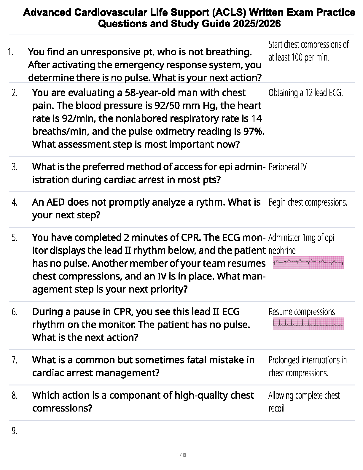 Get ready to ace your Advanced Cardiovascular Life Support (ACLS) certification exam with our premier 2025/2026 Test Bank. This essential study guide is packed with practice questions and verified answers, all aligned with the latest American Heart Association (AHA) guidelines. Master critical scenarios including CPR, ECG rhythm interpretation, pharmacology, and cardiac arrest management. Our expertly crafted resource is designed to help healthcare professionals like you pass the ACLS written exam confidently on the first attempt, saving you time and avoiding costly resits. Download now and take the first step towards your certification success!