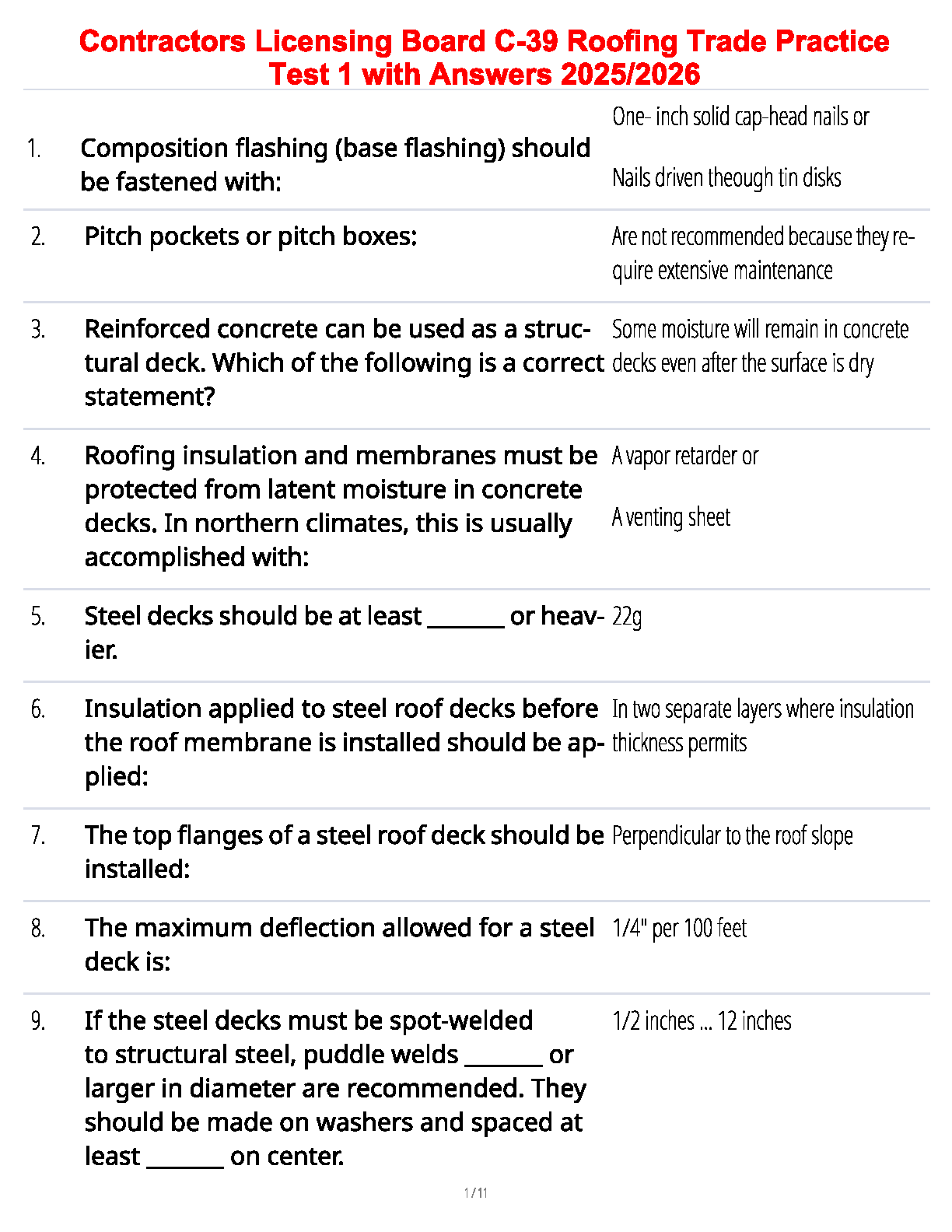 Get ready to ace your C-39 Roofing Contractor License exam on the first attempt with our latest 2025/2026 Test Bank. This comprehensive resource, featuring Test 1, is meticulously designed to help you avoid resits and secure your license efficiently. It provides a full set of practice questions paired with verified, easy-to-understand answers, covering all critical trade knowledge areas such as flashing techniques, roof deck installation (steel and concrete), insulation, membranes, and safety protocols. Stop worrying and start preparing with the ultimate study guide to ensure your success.