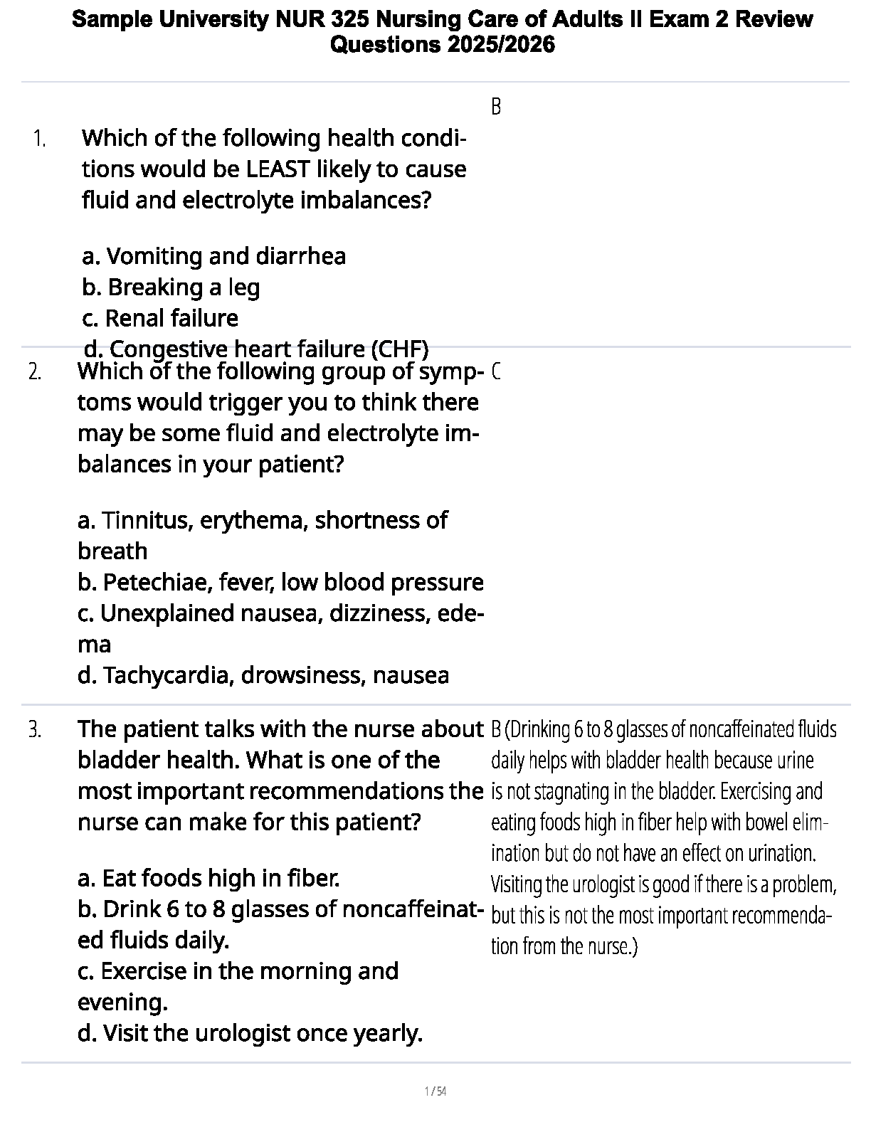 Elevate your study routine with the latest 2025/2026 Test Bank for NUR 325: Nursing Care of Adults II, Exam 2. This complete 54-page guide is packed with verified review questions and detailed answers to help you master complex topics like fluid and electrolyte imbalances and critical patient care scenarios. Designed to mirror your actual exam, this resource is your ultimate tool for passing on the first attempt and achieving top grades. Avoid resits and build confidence for your nursing career.
