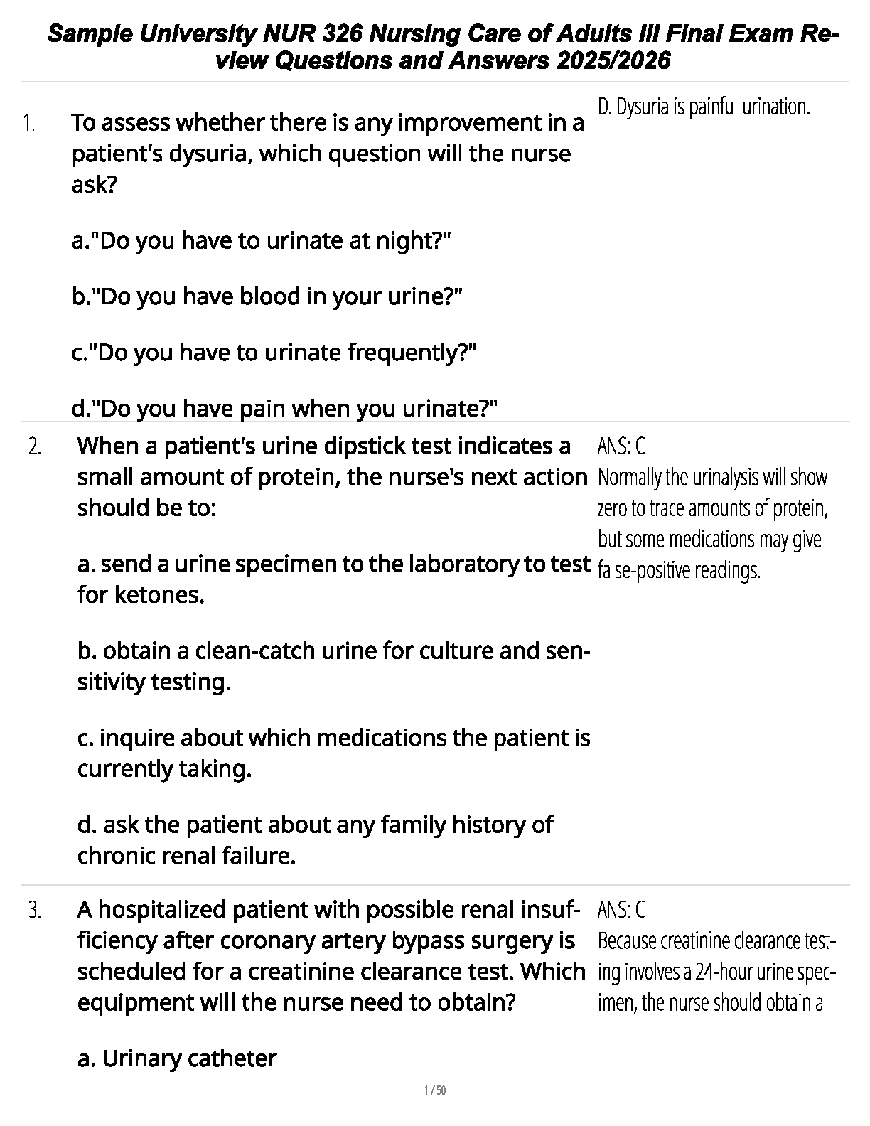 Excel in your NUR 326 Nursing Care of Adults III final exam with this comprehensive and verified test bank for the 2025/2026 academic year. This essential study resource is packed with a wide range of exam-style questions, complete with detailed answers and rationales. Designed to cover all key topics in advanced adult nursing, this guide will help you master complex concepts, enhance your critical thinking skills, and build the confidence needed to pass your final exam with flying colors. Get immediate access to this invaluable tool and take the most effective step towards acing your course.