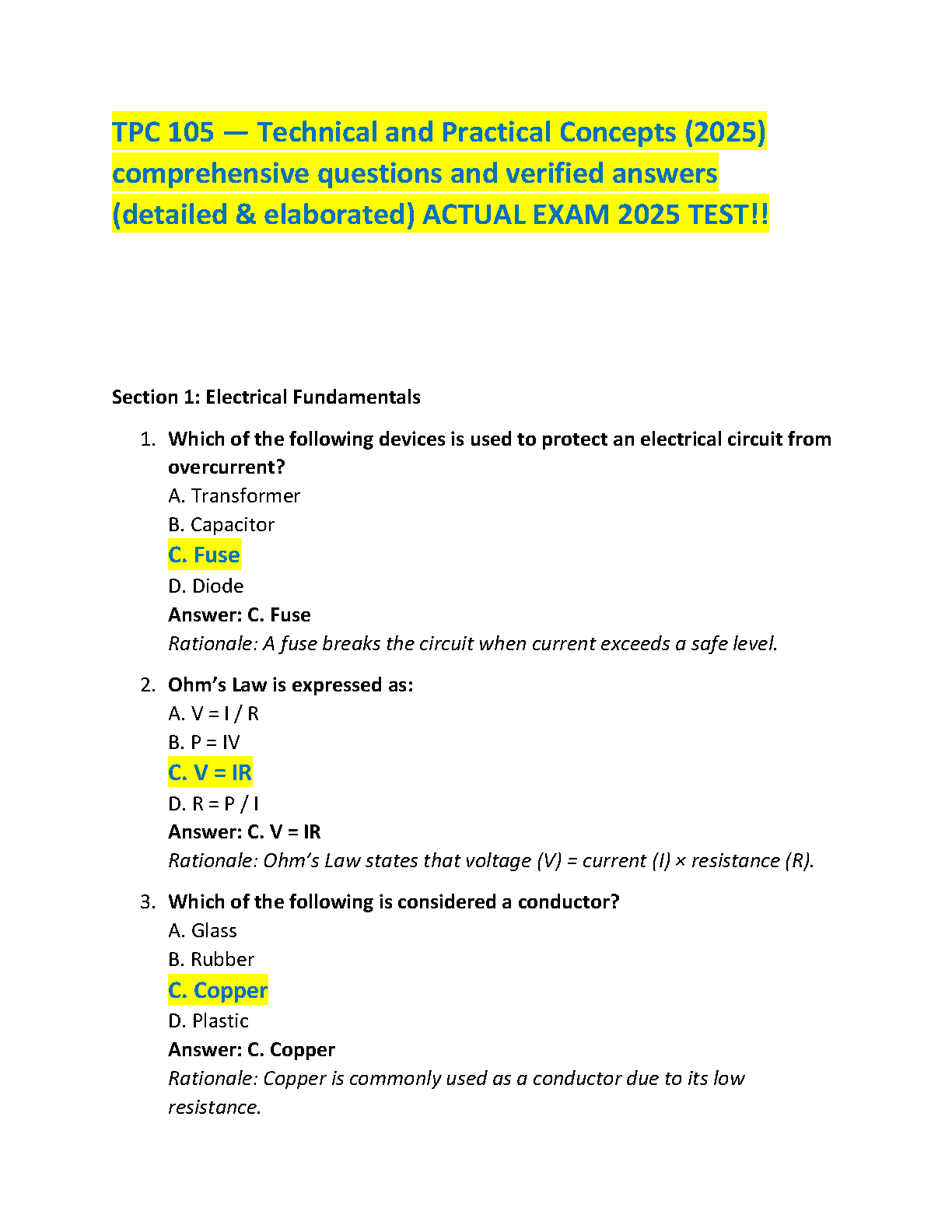 Ace your TPC 105 exam with our comprehensive test bank for the 2025/2026 academic year. This essential study guide covers all key topics in Technical and Practical Concepts, starting with a deep dive into Electrical Fundamentals. Inside, you'll find a complete collection of actual exam-style questions, each accompanied by a verified answer and a detailed, elaborated rationale. This resource is expertly designed to help you grasp complex concepts, test your knowledge, and pass your exams on the very first try, eliminating the need for resits. Get the confidence you need to succeed in TPC 105!