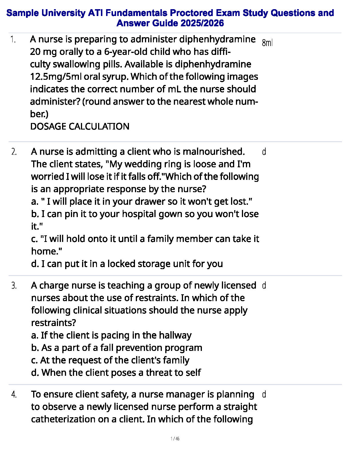 Ace your ATI Fundamentals Proctored Exam with this newly updated study guide for the 2025/2026 academic year. This comprehensive resource features a curated collection of practice questions and detailed answers, mirroring the format and difficulty of the actual exam. It covers essential nursing topics such as dosage calculations, client safety protocols, therapeutic communication, and fundamental procedures. Master the core concepts and boost your confidence to pass on your very first attempt and avoid costly resits.
