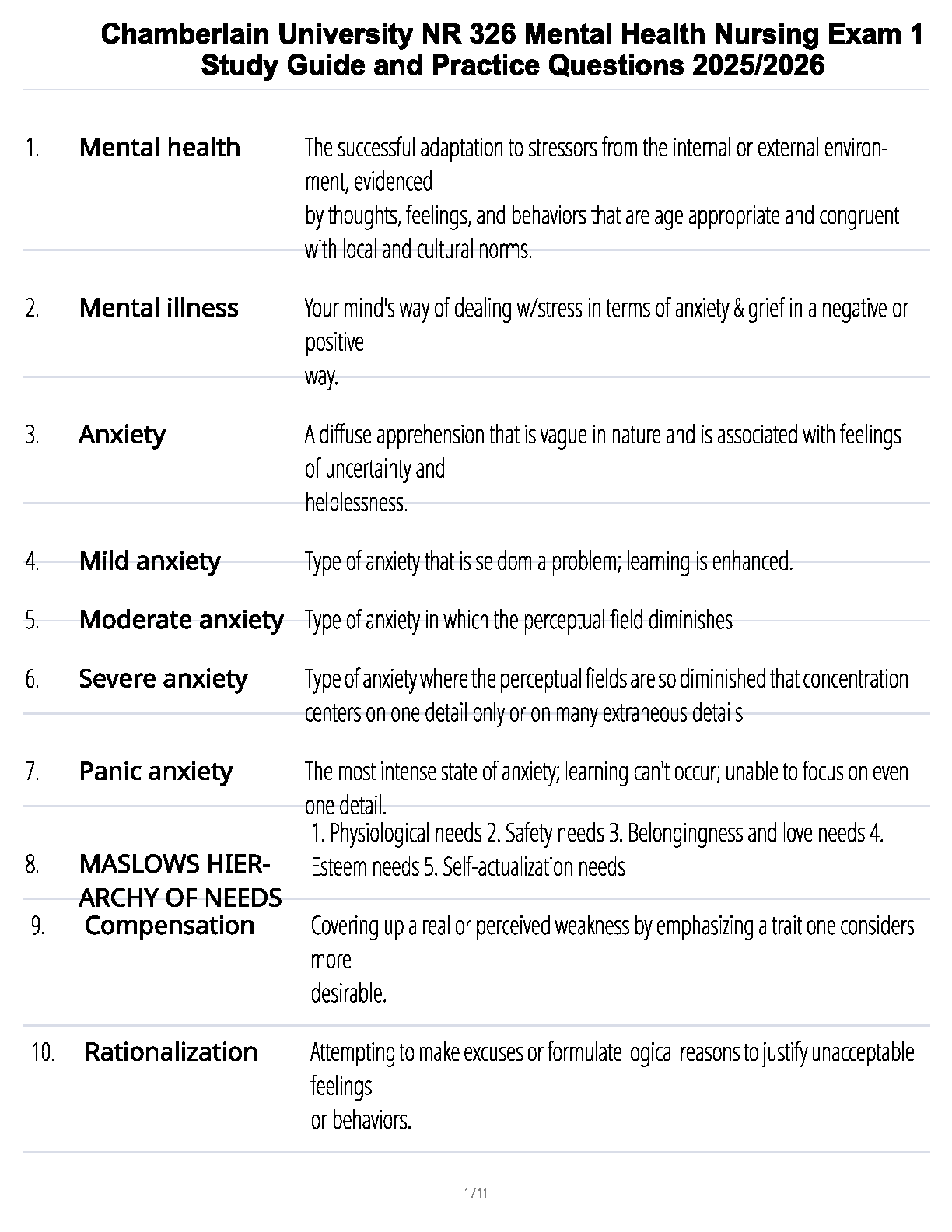 Master the core concepts of Mental Health Nursing with this comprehensive study guide tailored for Chamberlain University's NR 326 Exam 1. This recently updated resource for the 2025/2026 academic year provides in-depth explanations and practice questions covering essential topics such as anxiety disorders, Maslow's hierarchy, defense mechanisms, and the fundamentals of mental wellness. Designed to help you ace your exam on the first attempt, this guide simplifies complex topics, ensuring you build a strong foundation for success in your nursing career. Avoid resits and study smarter with our targeted, easy-to-understand materials.