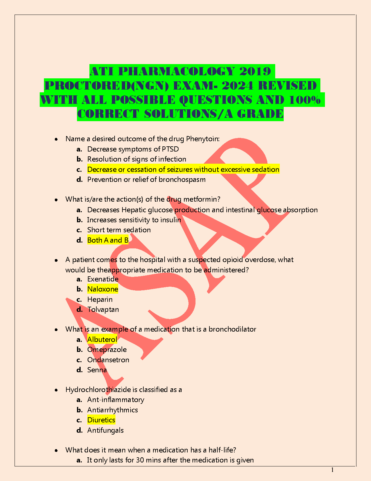 Master your upcoming ATI Pharmacology Proctored NGN Exam with our comprehensive 2024 revised test bank. This essential study guide features a complete collection of potential exam questions, each paired with a 100% accurate and verified answer. Designed to help you ace the test and secure an 'A' grade, this resource covers all critical topics, including drug actions, desired outcomes, and classifications. Stop stressing and start studying smart. Download now to gain the confidence you need to pass your pharmacology exam on the first try!