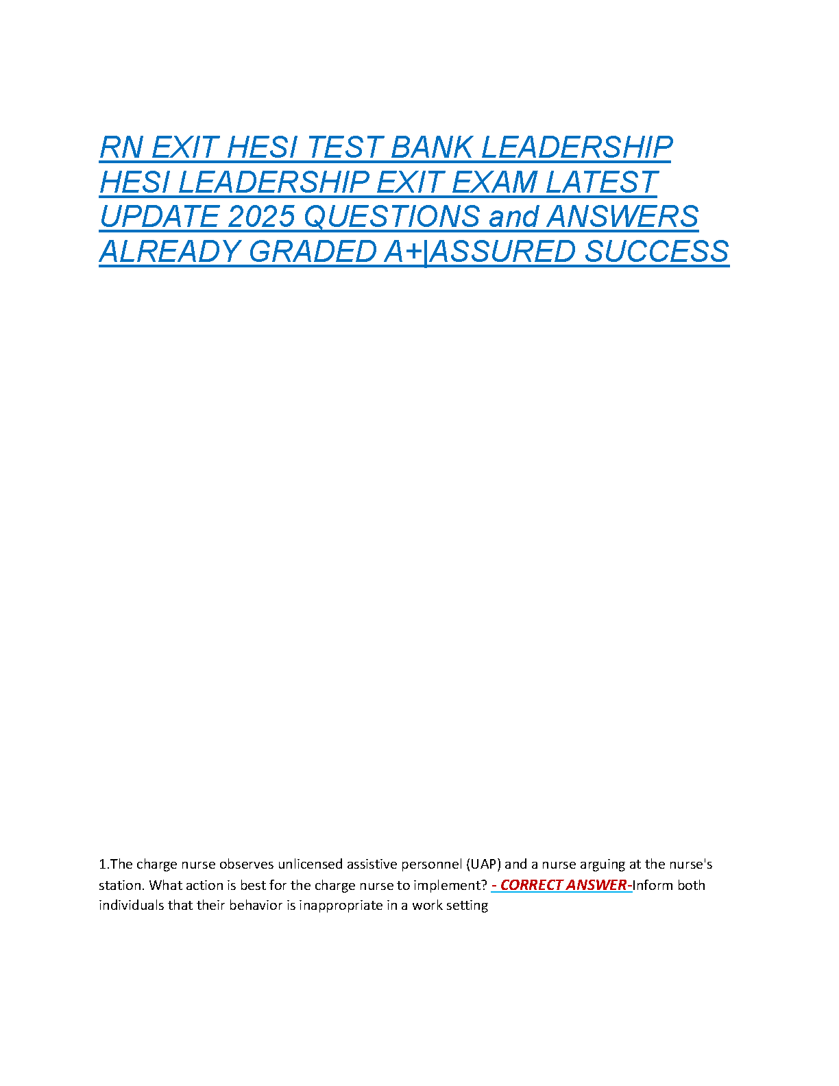 Ace your nursing boards with our latest 2025 HESI RN Leadership Exit Exam Test Bank! This comprehensive resource is packed with verified questions and detailed, A+ graded answers to ensure you master all critical leadership and management concepts. Designed for guaranteed success, this study guide helps you prepare effectively, build confidence, and pass on your first attempt. Get the edge you need to excel in your nursing career!