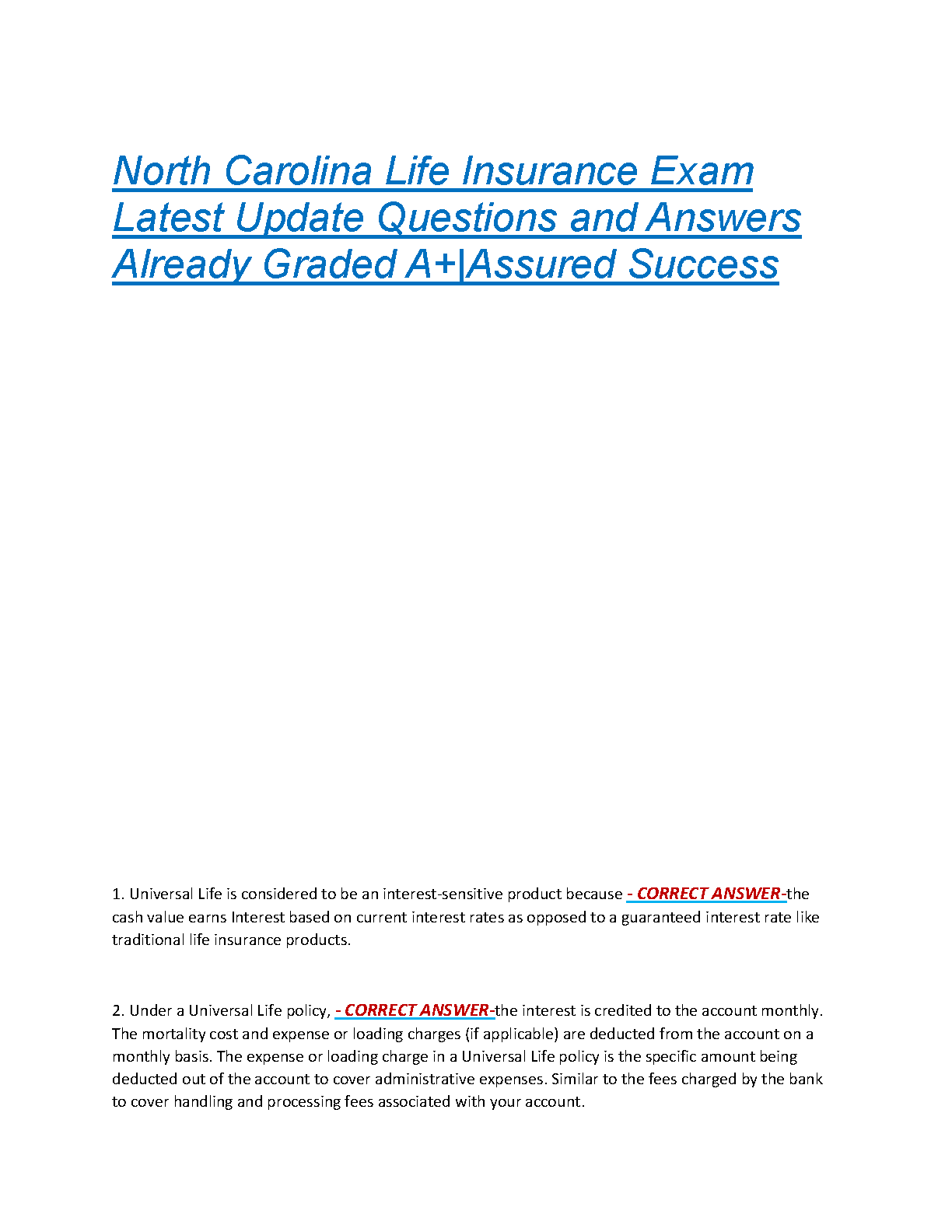 Latest 2025/2026 North Carolina Life Insurance Exam Test Bank: Verified Questions & Answers for Guaranteed Pass