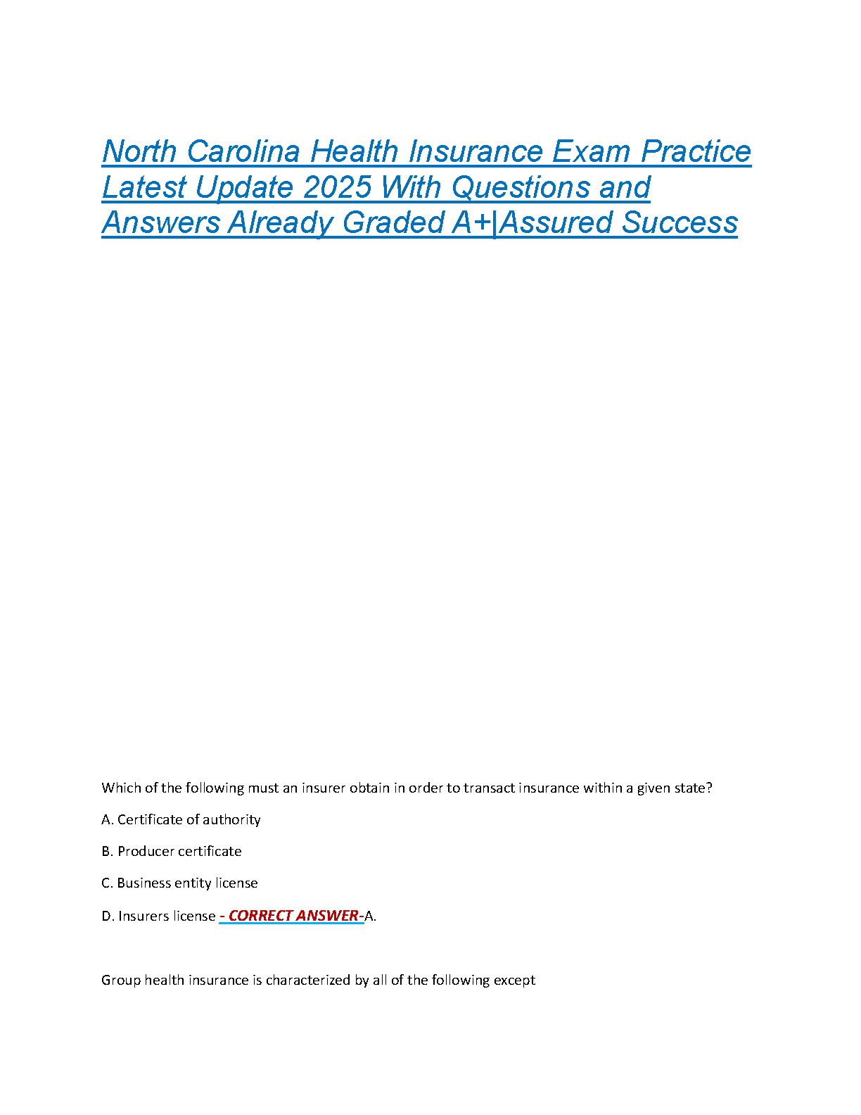 North Carolina Health Insurance Exam Test Bank 2025: Latest Practice Questions and Verified Answers for Guaranteed A+ Success