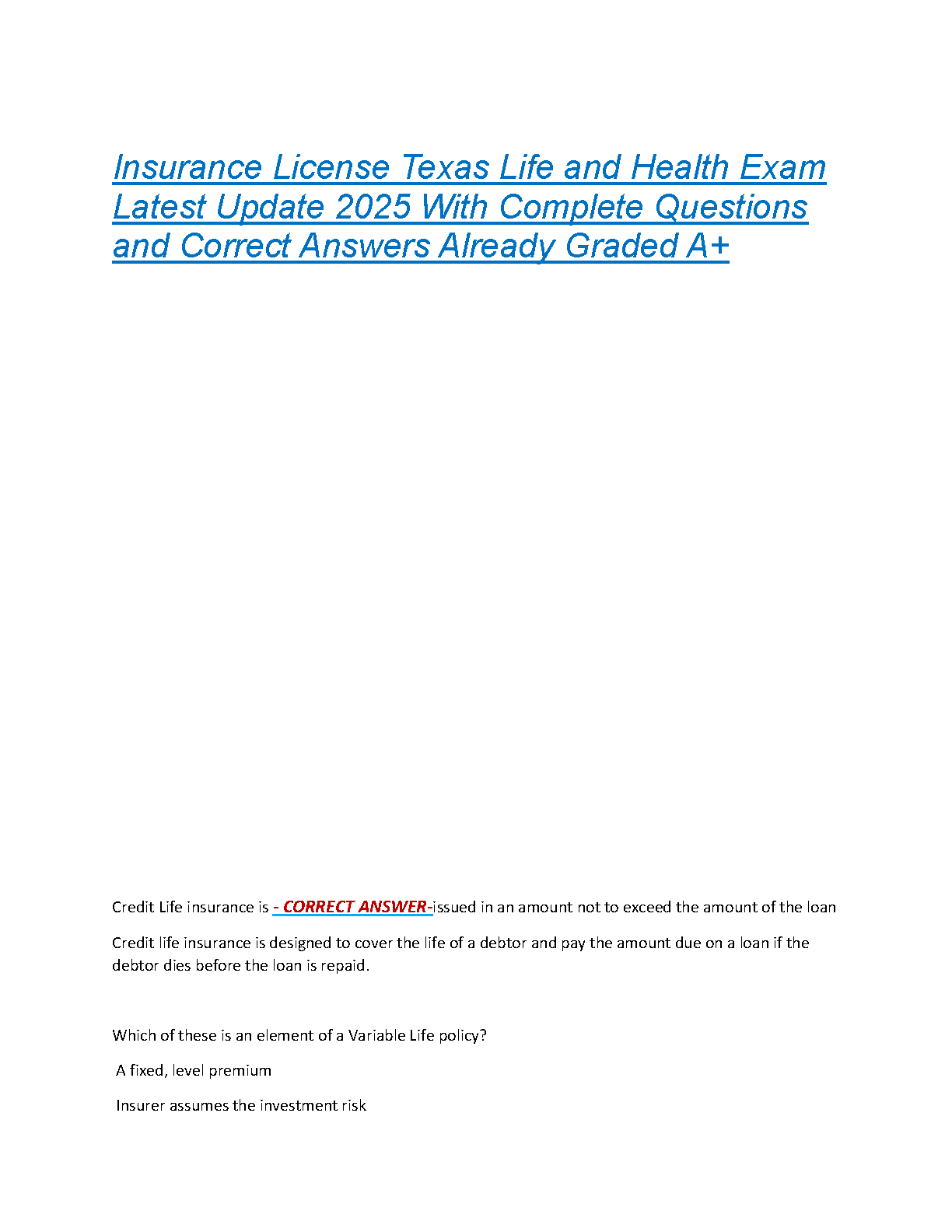 Ace your Texas Life and Health Insurance License exam on the first try with our comprehensive 2025 updated study guide. This essential resource is packed with a complete set of practice questions and meticulously verified answers, all graded A+ to ensure you master the material. Designed for the 2025/2026 testing cycle, this guide covers all critical topics, helping you build confidence, avoid resits, and launch your career in the insurance industry. Get immediate access to the ultimate test preparation tool and secure your license efficiently.