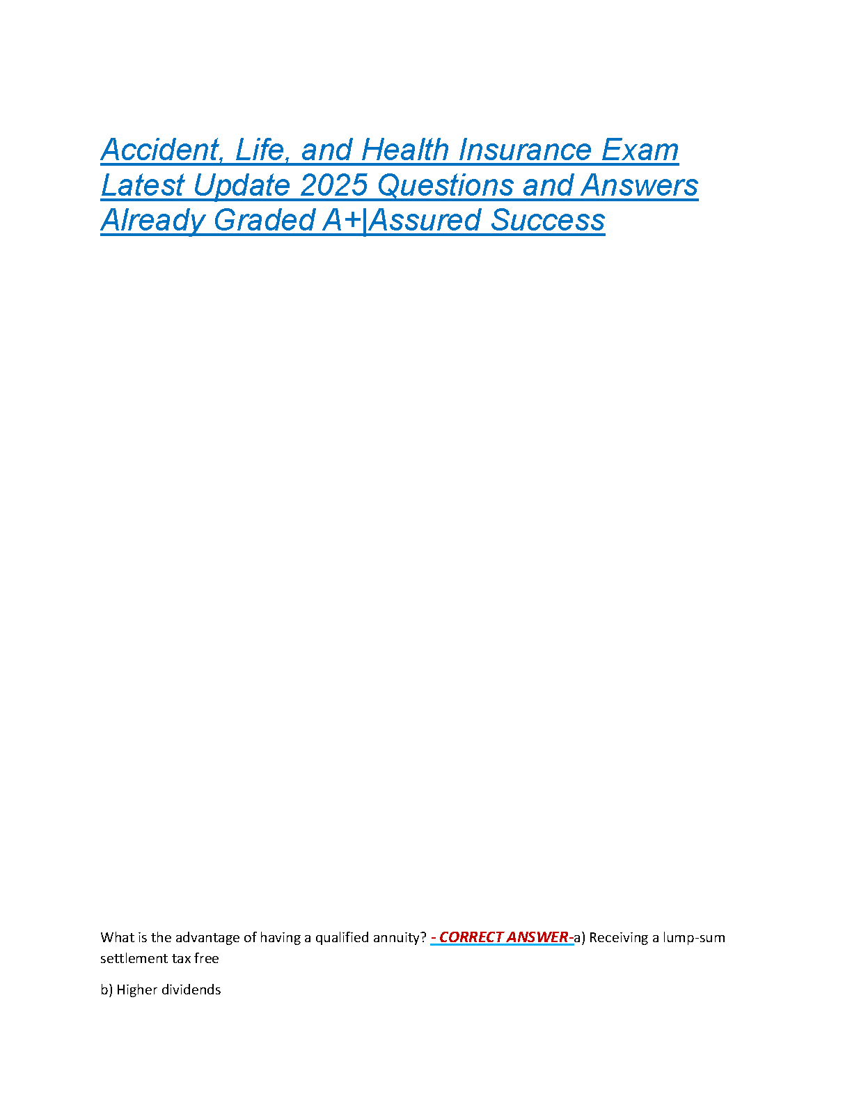 Prepare to ace your Accident, Life, and Health Insurance Exam on the first attempt with our latest 2025 test bank. This comprehensive resource is packed with a wide range of practice questions and meticulously verified answers, all designed to mirror the actual exam format and content. By studying with this A+ graded guide, you'll gain the confidence and knowledge needed to master key concepts and secure your certification without the stress of resits. Get instant access to the ultimate study tool for guaranteed success.