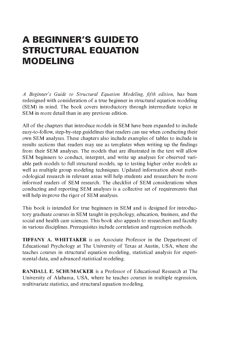 Ace your statistics and research methods exams with this comprehensive guide to Structural Equation Modeling (SEM). The latest 2025/2026 edition of 'A Beginner's Guide to Structural Equation Modeling' by Whittaker and Schumacher is designed to help you master complex concepts and pass on your first attempt. This non-technical introduction breaks down the fundamentals of SEM, making it accessible for everyone. This 5th edition includes updated examples, the latest software guidance, and brand-new chapters to ensure you have the most current information. Stop struggling with difficult statistical models and get the resource you need to succeed and avoid resits.