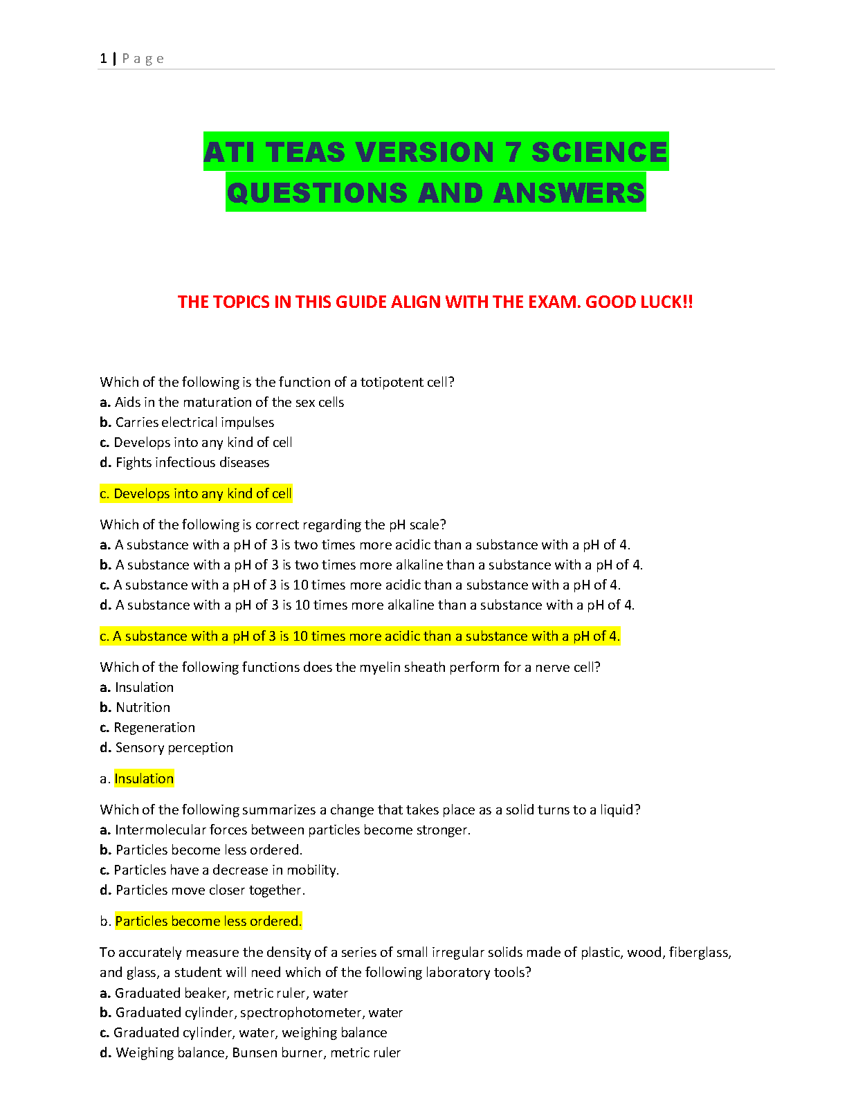Master the science portion of the ATI TEAS Version 7 exam with this all-inclusive test bank. Featuring a vast collection of exam-style questions paired with detailed, accurate answers, this study guide is your ultimate tool for success. It's specifically tailored to the TEAS 7 curriculum, ensuring you cover every crucial scientific principle. Prepare effectively, boost your confidence, and secure your spot in nursing school by passing on your first attempt. Instantly download and begin your focused prep now!