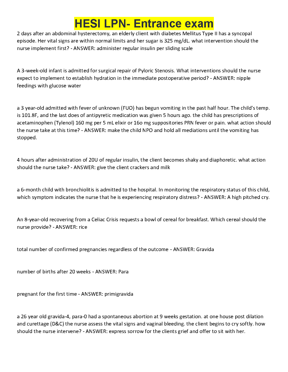 Prepare to excel on your HESI LPN Entrance Exam with our newly updated 2025/2026 Test Bank. This comprehensive resource is packed with detailed questions and verified answers covering a wide range of essential nursing topics, including pediatrics, obstetrics, medical-surgical nursing, and pharmacology. Each scenario is designed to test your clinical judgment and critical thinking skills, mirroring the actual exam format. By studying with this guide, you'll gain the confidence and knowledge needed to pass your LPN entrance exam successfully on your first attempt, starting your nursing career without delay.