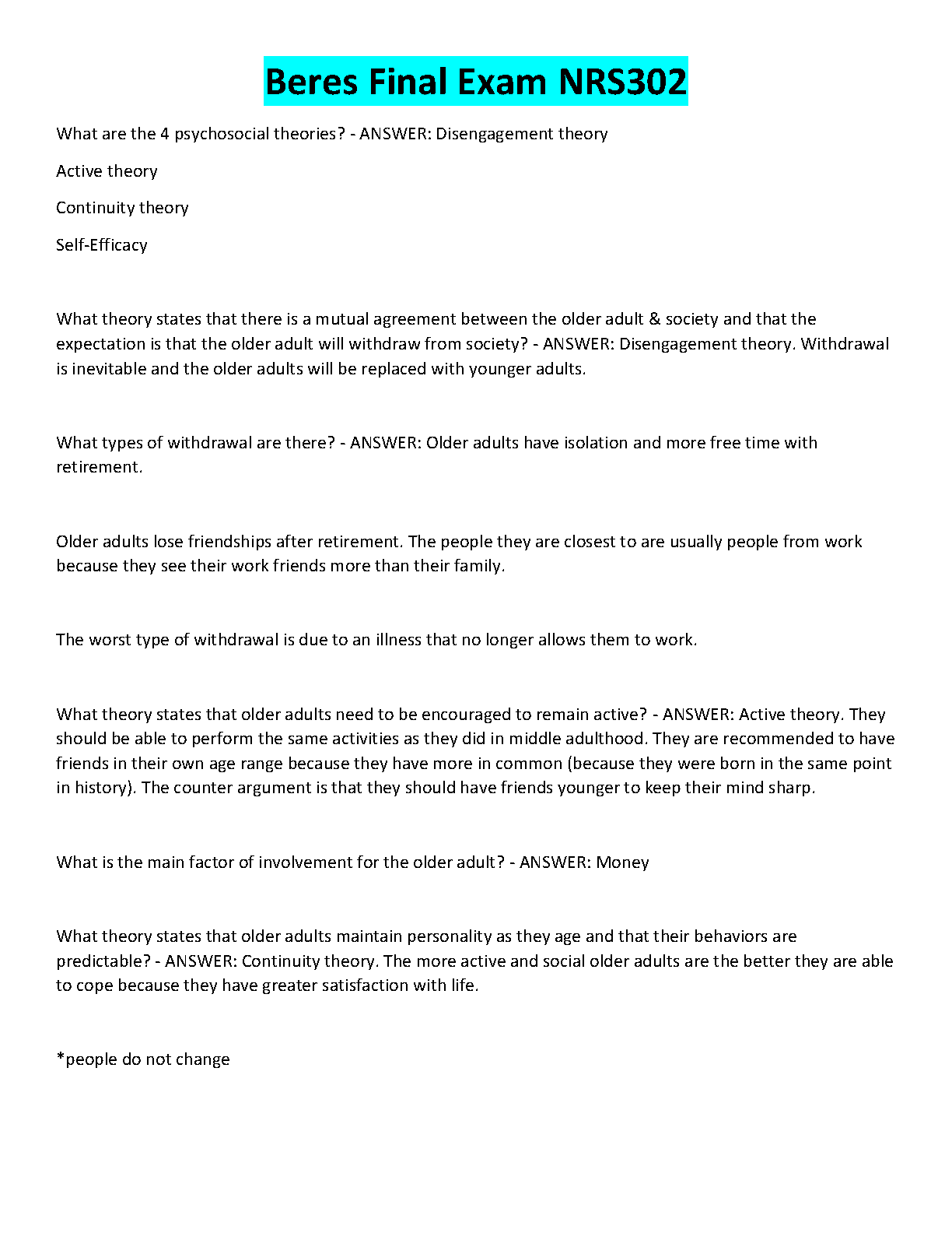 NRS302 Beres Final Exam Test Bank: Complete Questions and Answers on Psychosocial Theories of Aging