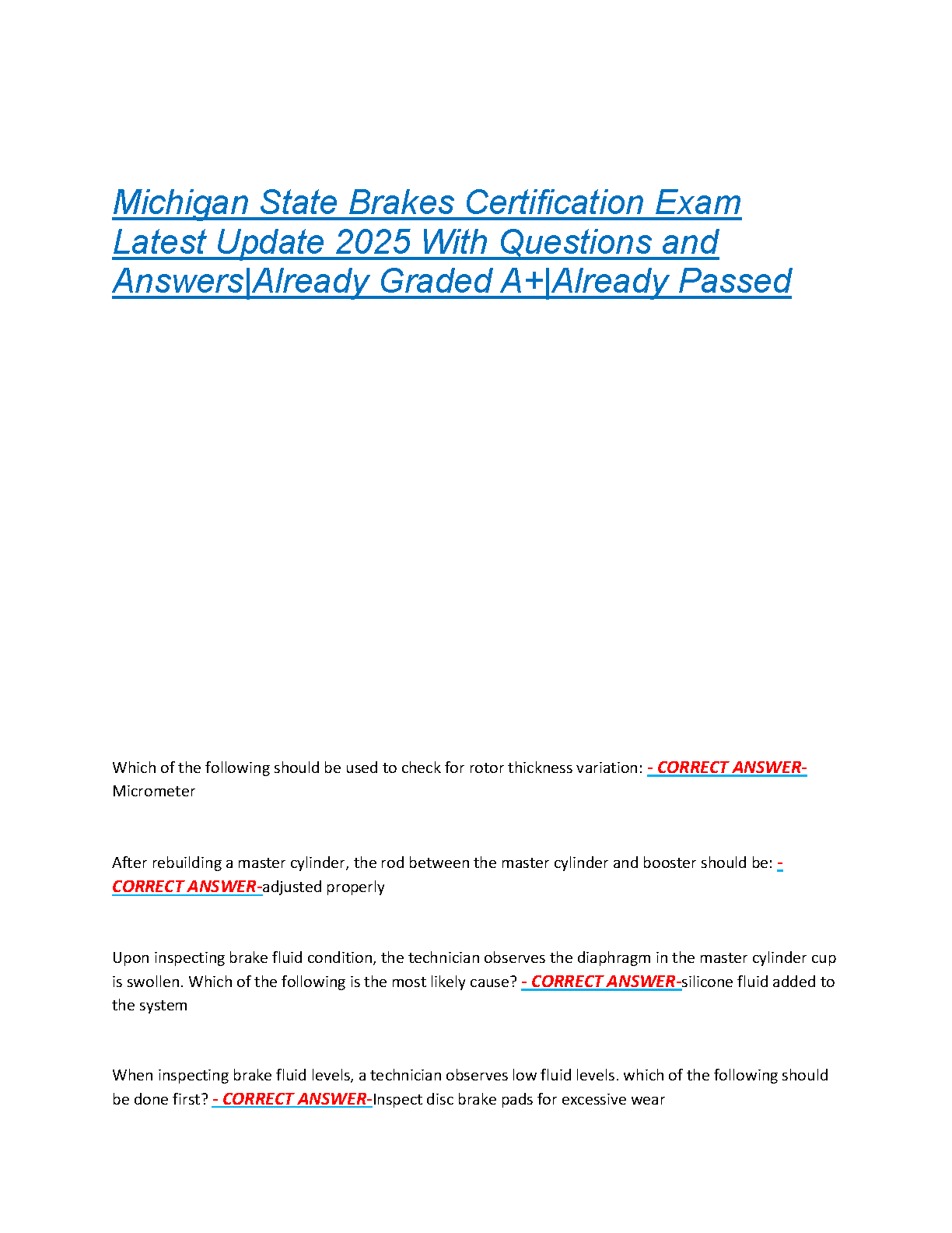 Michigan State Brakes Certification Exam 2025 Test Bank: A+ Graded Questions and Verified Answers