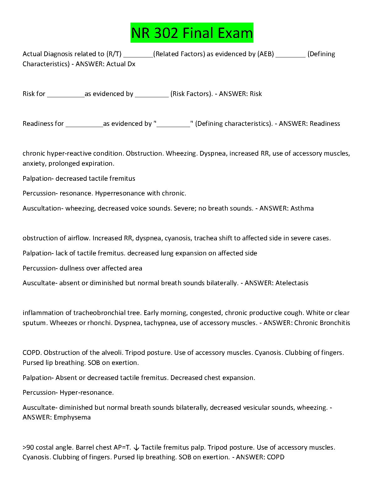 Ace the NR 302 Final Exam: A+ Study Guide on Nursing Diagnosis and Respiratory Disorders - Latest 2025/2026 Edition