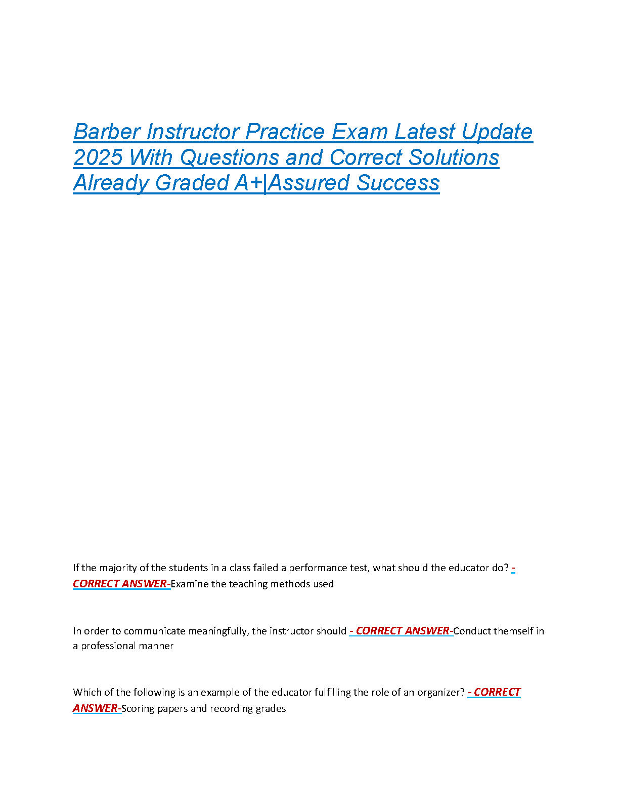 Barber Instructor Exam Test Bank 2025/2026: Latest Q&A with Correct Solutions for A+ Grade & Assured Success