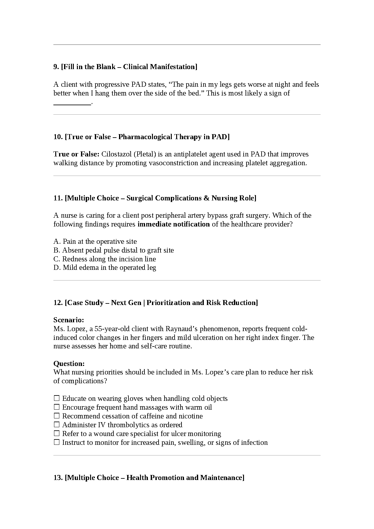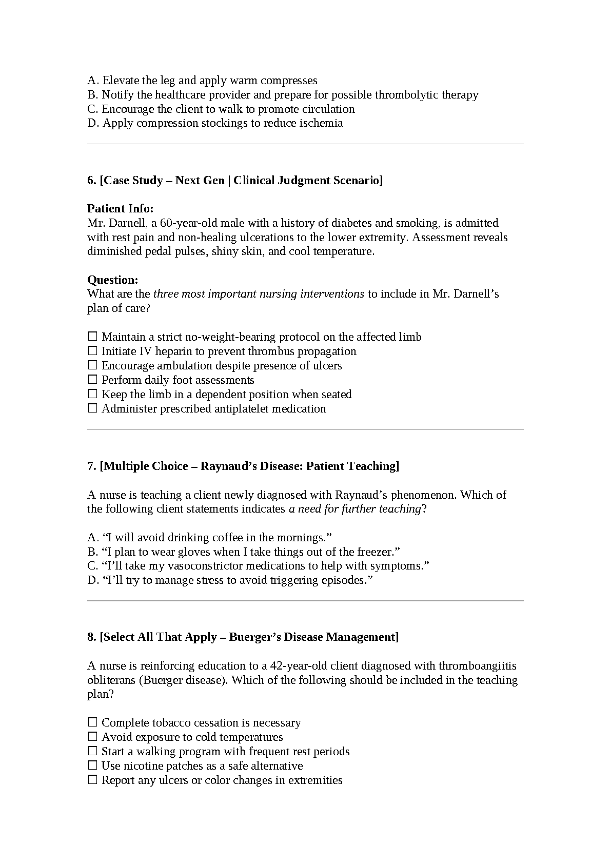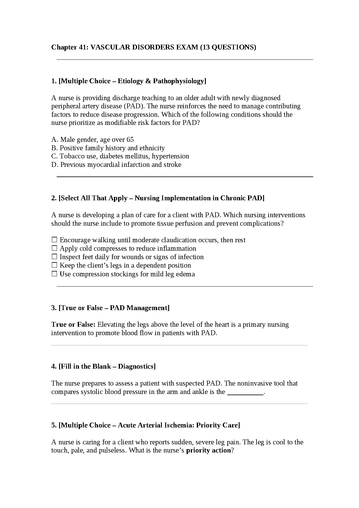 Unlock your academic potential with this comprehensive Test Bank for Chapter 41, 'Vascular Disorders,' from the 11th Edition of Ignatavicius, Workman, Rebar, and Heimgartner's Medical-Surgical Nursing. This study guide contains 13 expertly crafted questions, including multiple-choice and select-all-that-apply, designed to mirror the NCLEX format. Deepen your understanding of Peripheral Artery Disease (PAD), patient assessment, nursing interventions, and priority care. This is the ultimate tool for nursing students aiming to master complex vascular concepts and ace their exams on the first try.