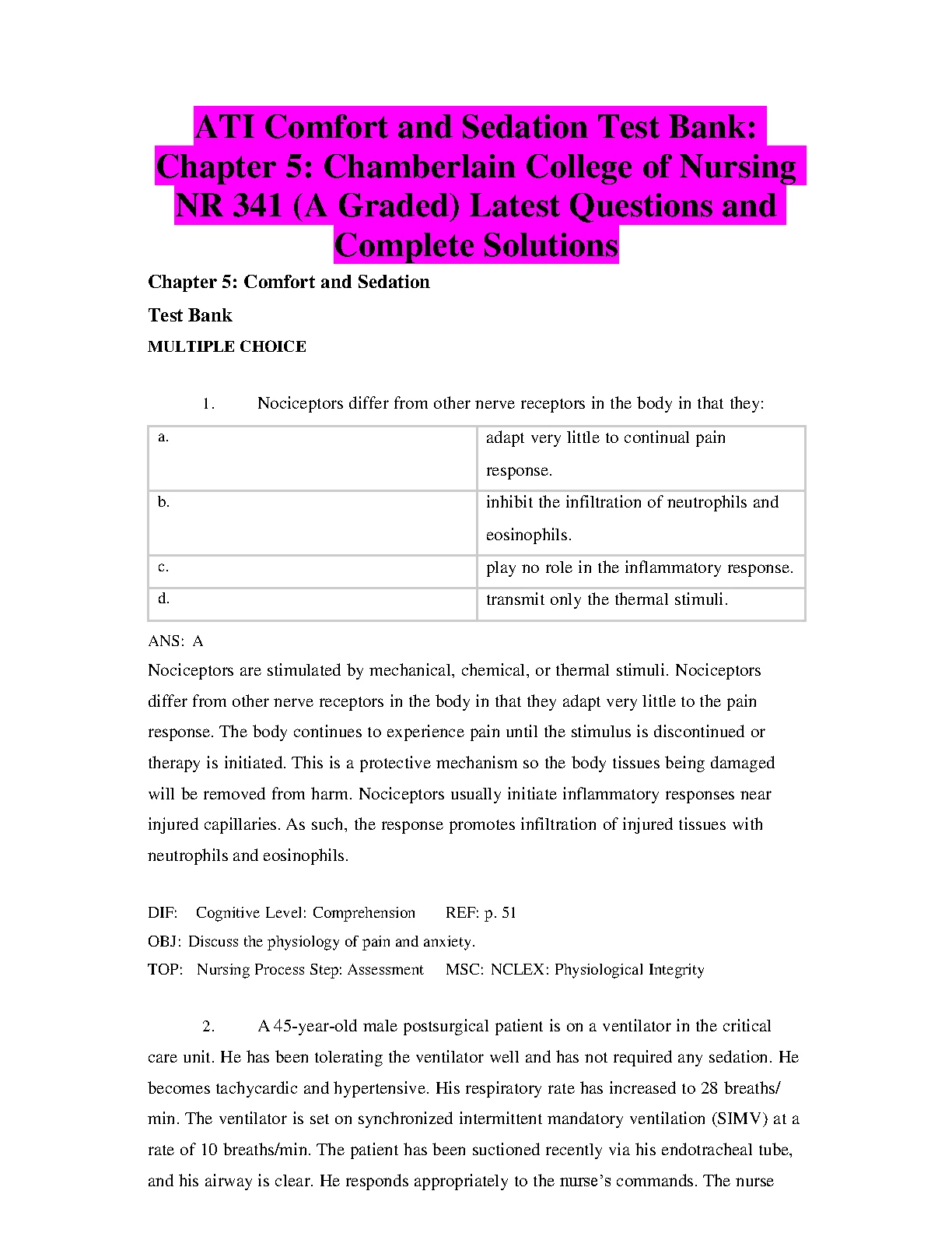 TEST BANK FOR ATI Comfort and Sedation Chapter 5: Chamberlain College of Nursing NR 341. DOWNLOAD on www.hackedexams.com INSTANTLY.