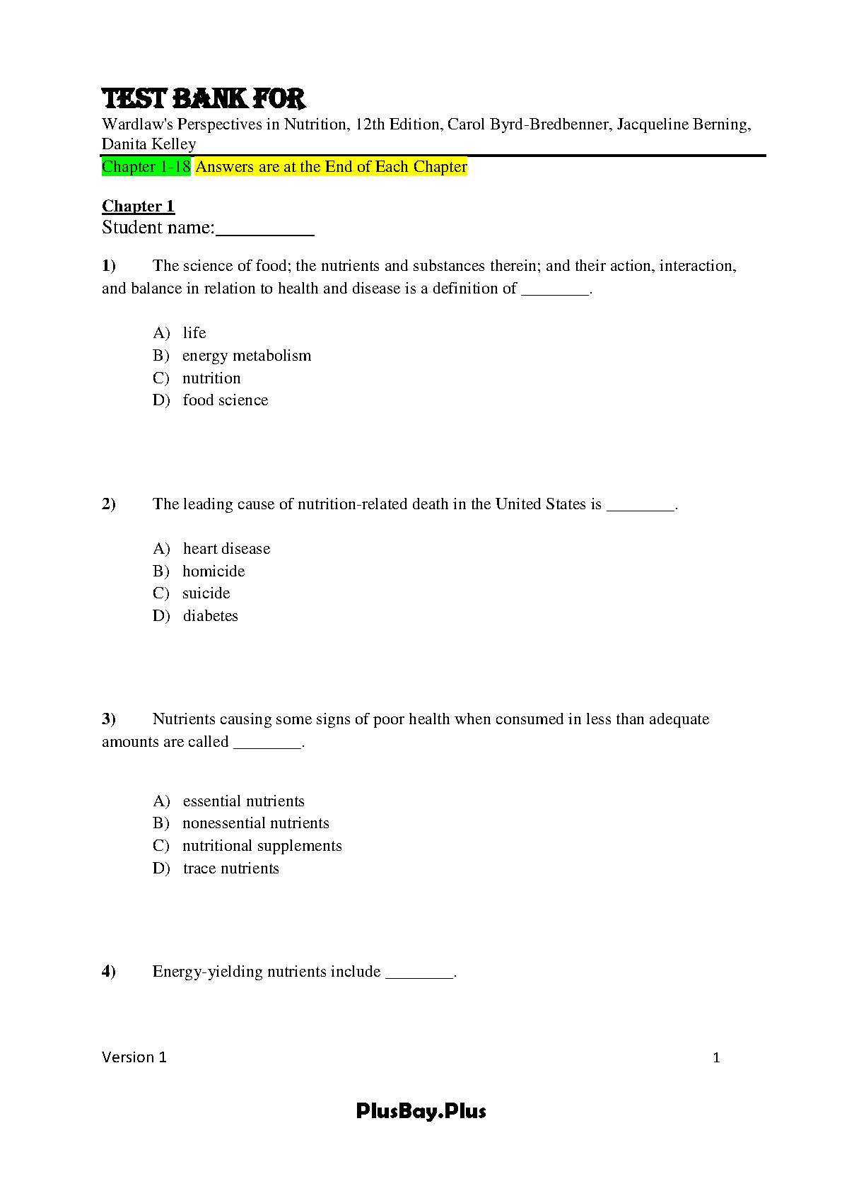 Test Bank for Wardlaw's Perspectives in Nutrition, 12th Edition by Carol Byrd-Bredbenner, Jacqueline Berning, Danita Kelley & Gaile Moe