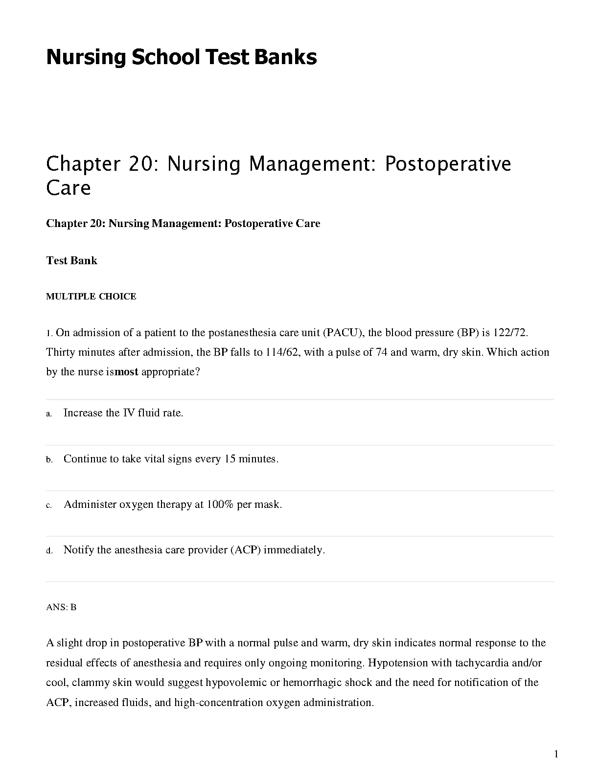 TEST BANK FOR NURSING (Chapter 20: Nursing Management: Postoperative Care). DOWNLOAD on www.hackedexams.com INSTANTLY.