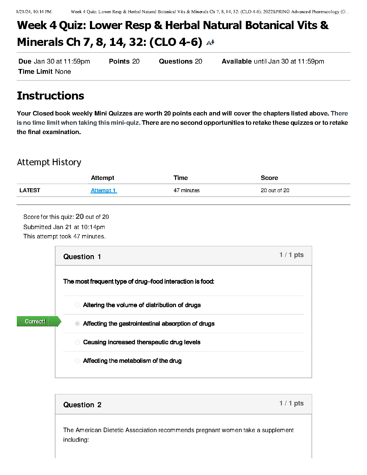 Advanced Pharmacology: Week 4 Quiz Answers - Lower Respiratory, Herbal & Botanical Supplements, Vitamins & Minerals (Graded A+)