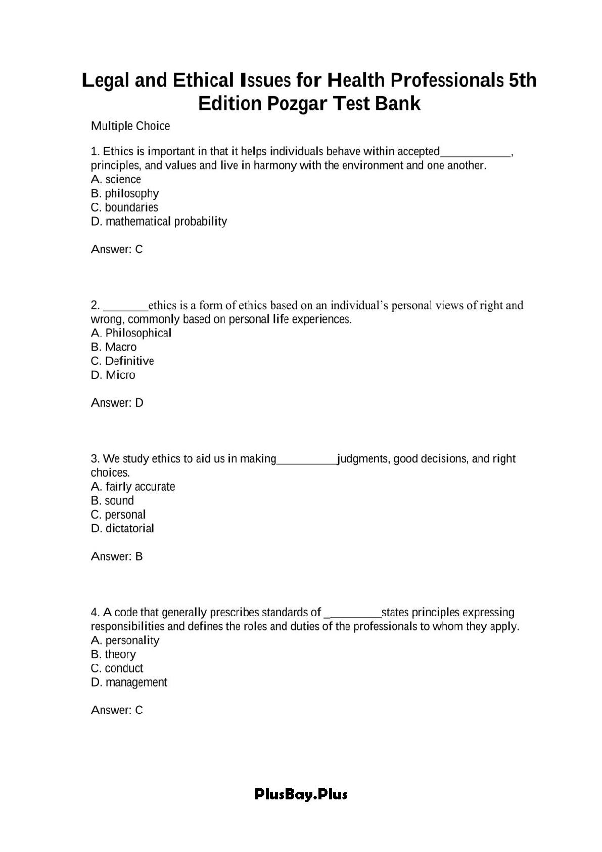 Gain a critical edge in your studies with the official Test Bank for 'Legal and Ethical Issues for Health Professionals, 5th Edition' by George D. Pozgar. This essential resource provides a comprehensive collection of exam-style multiple-choice questions, complete with accurate answers, covering all key topics from the textbook. It is meticulously designed to help you master complex concepts, test your understanding, and build confidence for your exams. Prepare smarter, not harder, and ensure you have the knowledge to excel in your course and future healthcare career.