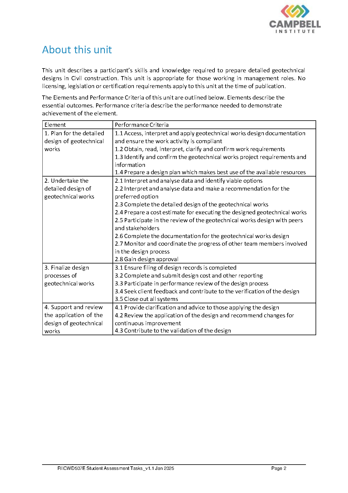 Excel in your studies with the most up-to-date Student Assessment Tasks for RIICWD507D: Prepare detailed geotechnical design. This comprehensive resource, updated for the 2025/2026 academic year, provides a complete set of tasks and elaborations designed to mirror your final assessments. Master key concepts in geotechnical design and ensure you pass your exams on the first attempt, avoiding costly resits. This is the ultimate study companion for students undertaking this unit.