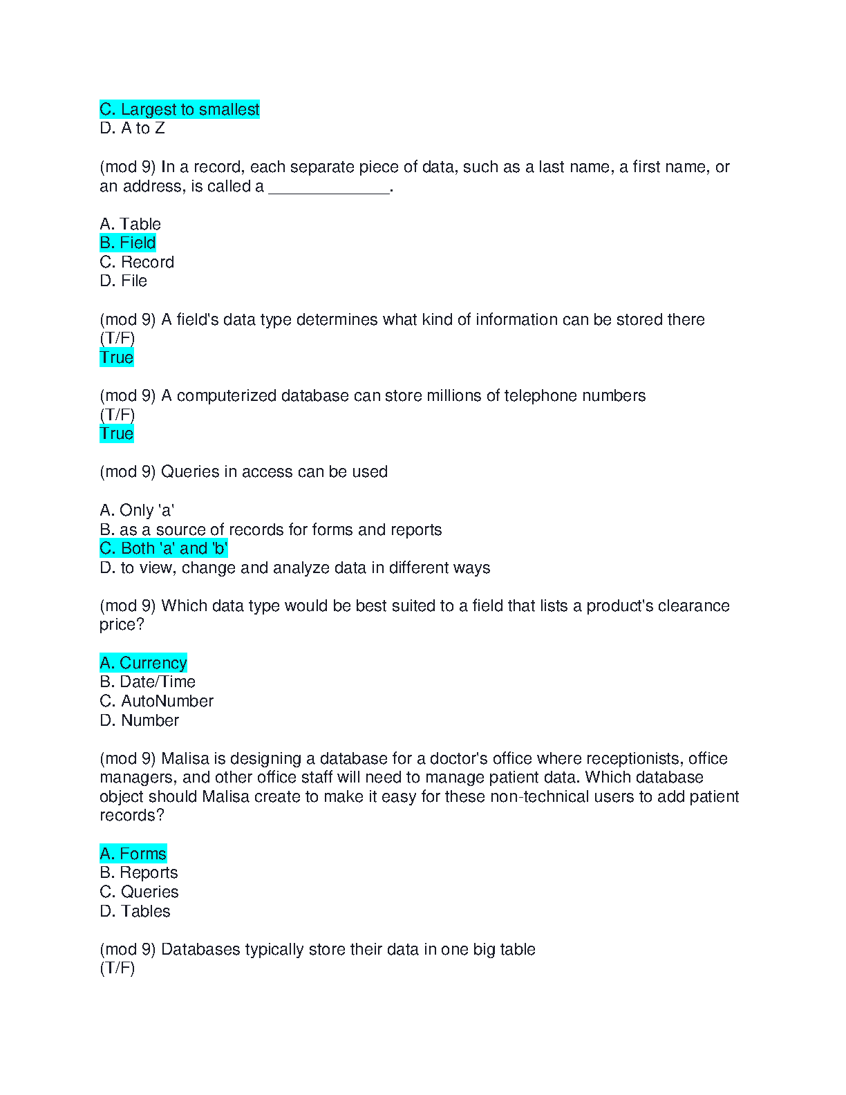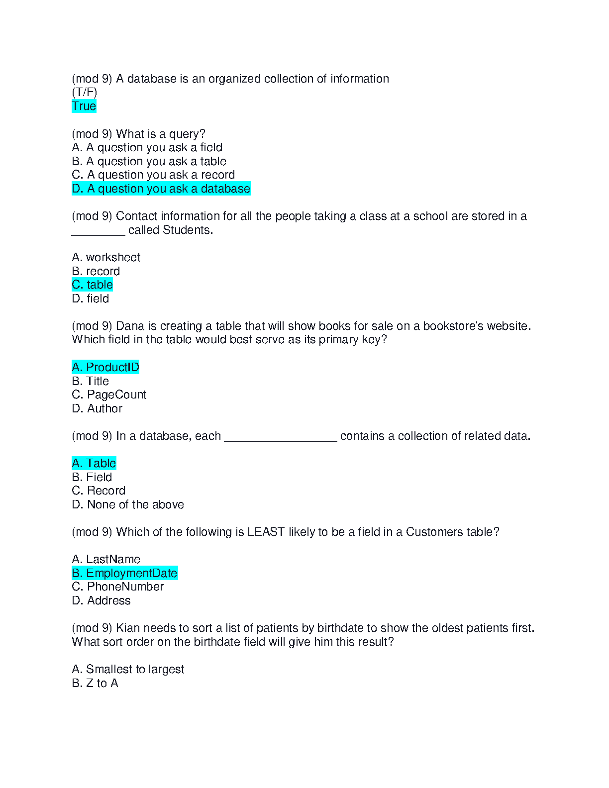 Ace your ITE 152 Exam 3 with this comprehensive test bank! This study guide features a complete set of questions and 100% correct, verified answers covering essential database concepts from Module 9. Topics include table design, appropriate data types (Yes/No, Hyperlink), table views, fields, records, and table relationships. This is the ultimate resource to help you study efficiently, master the material, and pass your exam on the first try. Perfect for students aiming for top grades in their Digital and Information Literacy course.