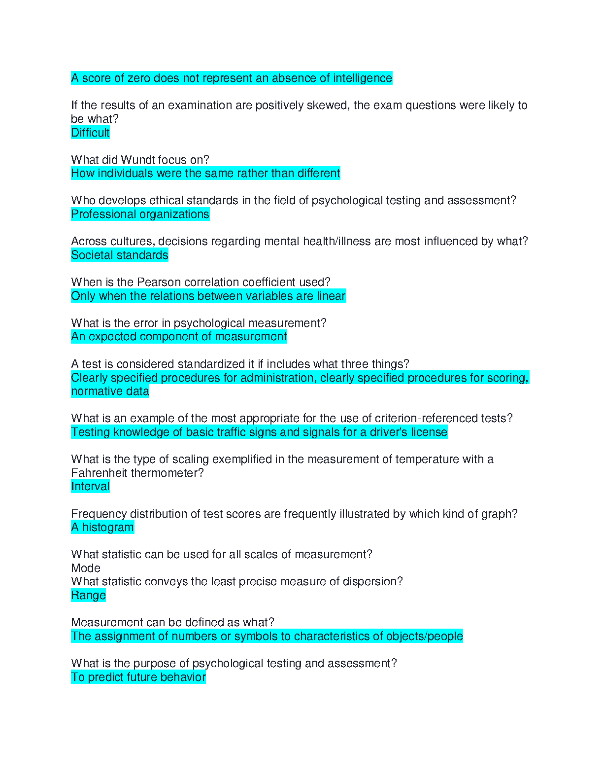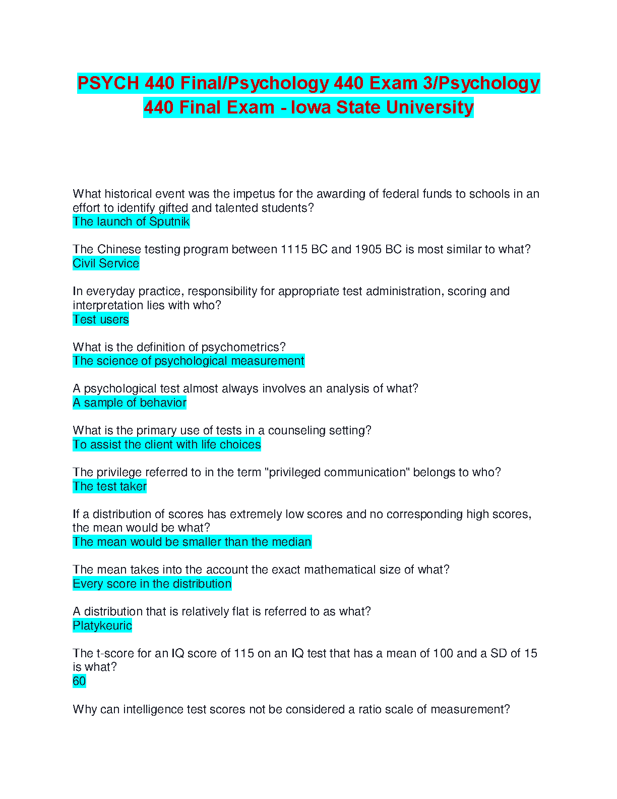 Unlock academic success in PSYCH 440 at Iowa State University with our latest 2025/2026 final exam elaboration. This comprehensive guide provides meticulously solved questions and answers, covering all essential topics from the course, including the definition of psychometrics, statistical analysis in psychology, historical perspectives like the Sputnik launch's impact, and score calculations. Designed to help you grasp complex concepts quickly and confidently, this resource is your key to passing the final exam on your first attempt. Don't leave your grade to chance—prepare with the best materials and avoid resits.